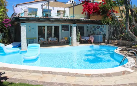 "Surphinia" is a cosy and comfortable detached villa surrounded by trees and meadows in a quiet, sunny residential area near Bari Sardo, Italy. This two-story vacation rental offers a private garden, swimming pool, outdoor shower, patio, pergola, garden furniture, barbecue, fireplace, and barbecue house. Enjoy amenities such as Internet Wifi, Parking, Tennis Court, a Yard, and a Swimming Pool.