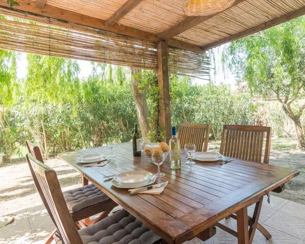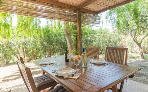 The outdoor areas of "San Pietro Green" are a true highlight of the property, offering ample space to enjoy the warm Mediterranean climate in a serene and private setting. The fully fenced garden of 200 square metres surrounds the house and provides a secure and intimate environment, perfect for outdoor relaxation and al fresco living. An outdoor shower is available for your convenience, particularly practical after a refreshing visit to the nearby beach. Please be aware that the use of a barbecue is not permitted on the property.
