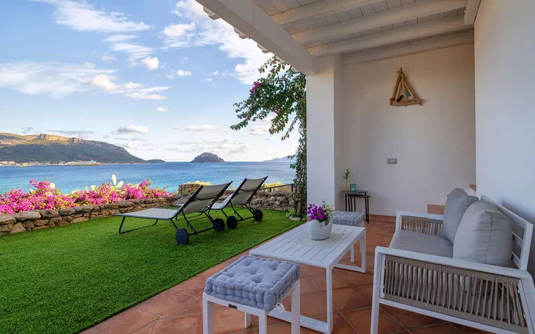 The upper floor, characterized by sloping ceilings, houses the second double bedroom, which is equipped with a hand-basin and a separate WC. Please be aware that access to this upper-floor room is via a steep staircase, which is not suitable for children. The property also benefits from a partly roofed terrace and a garden, both furnished with terrace furniture and offering a marvellous view of the sea.