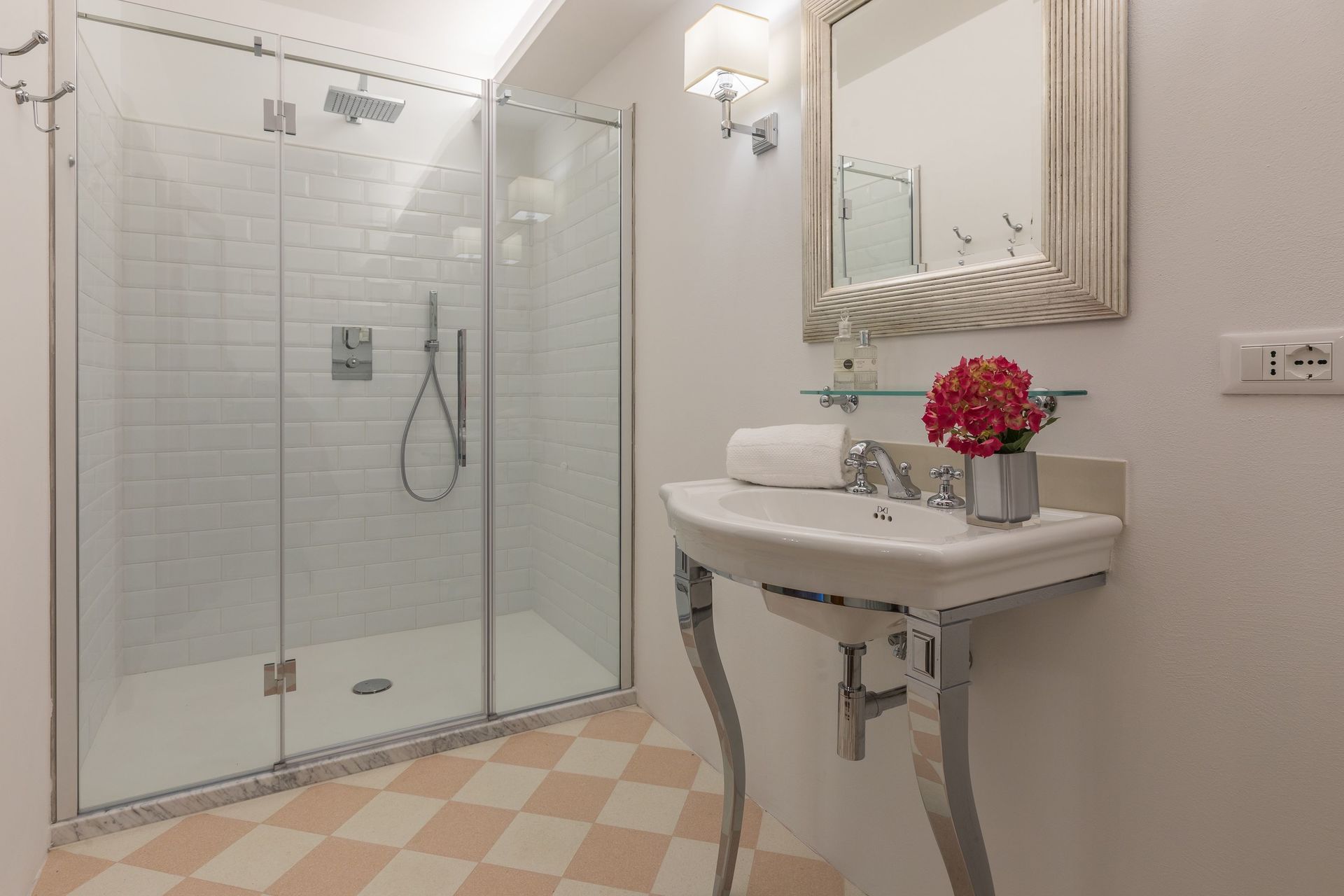 Bathroom: basin, toilet, shower.