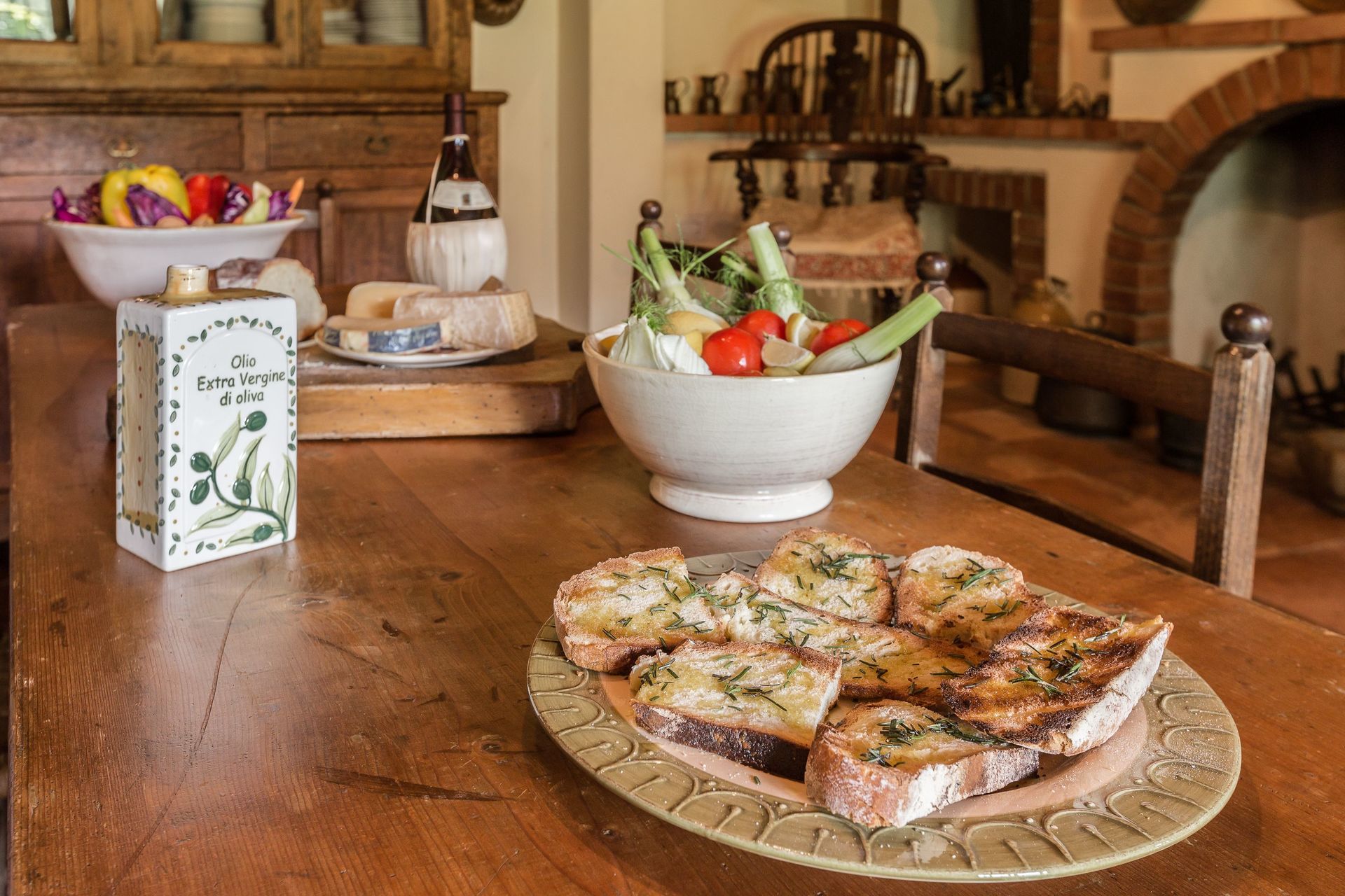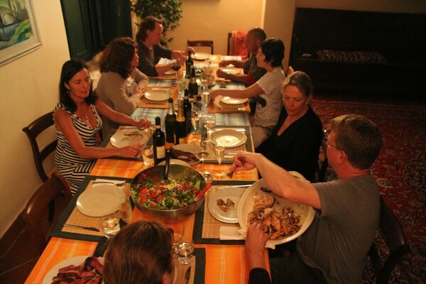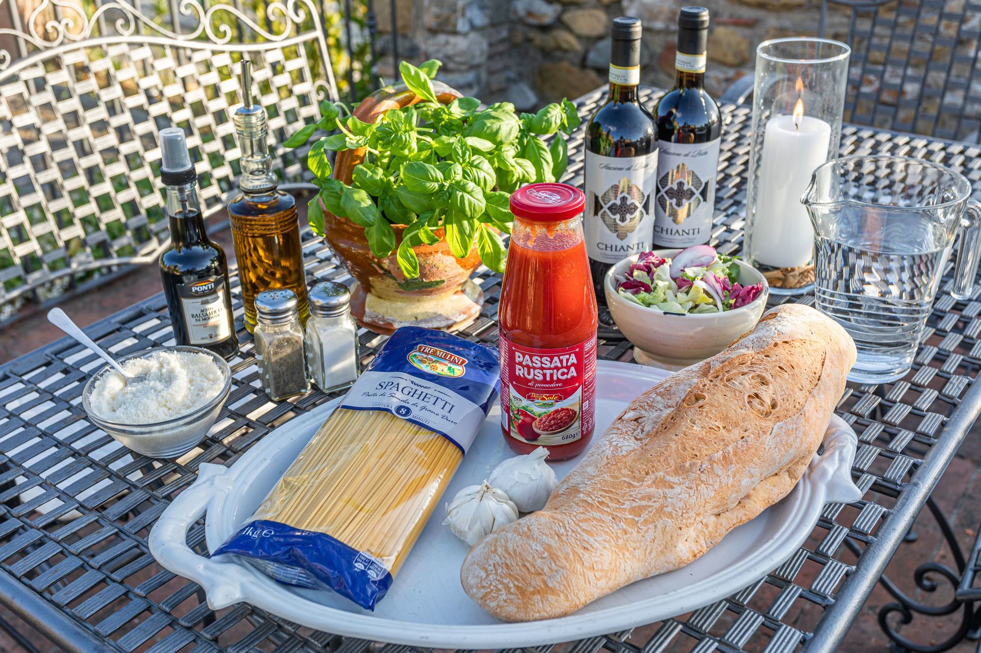 Everything you need for dinner on the evening of the arrival: homemade pasta, parmesan, bread and salad, Chianti wine and water