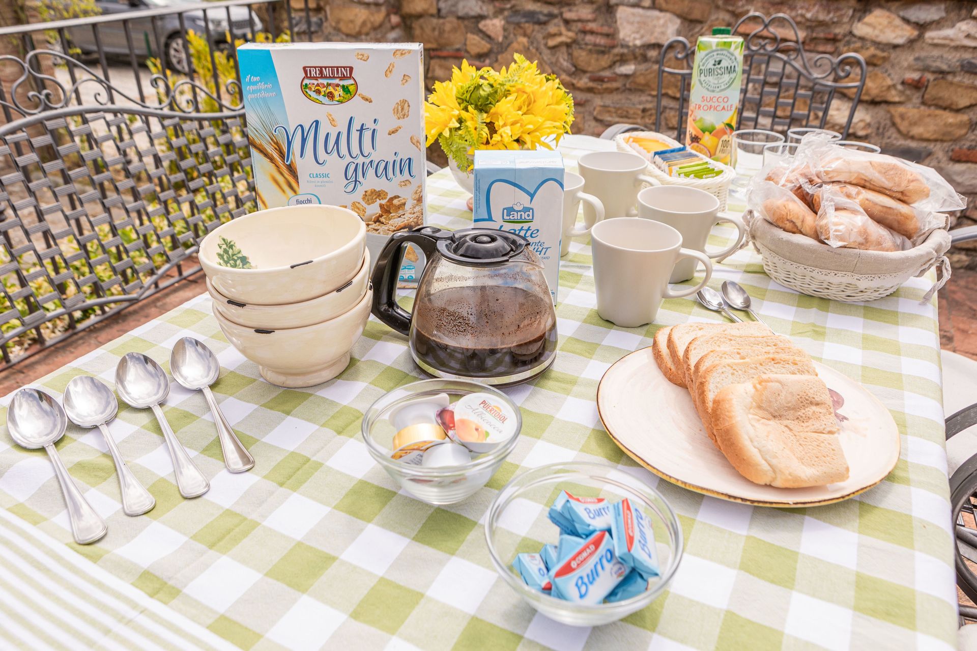 Everything you need for breakfast for the following morning: toast, croissants, jam, butter, honey, cereals, fruit juice, coffee, tea, milk