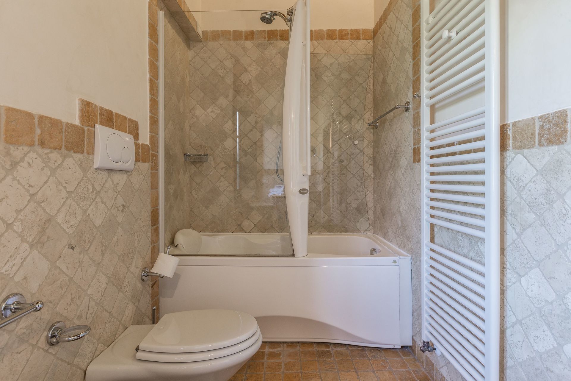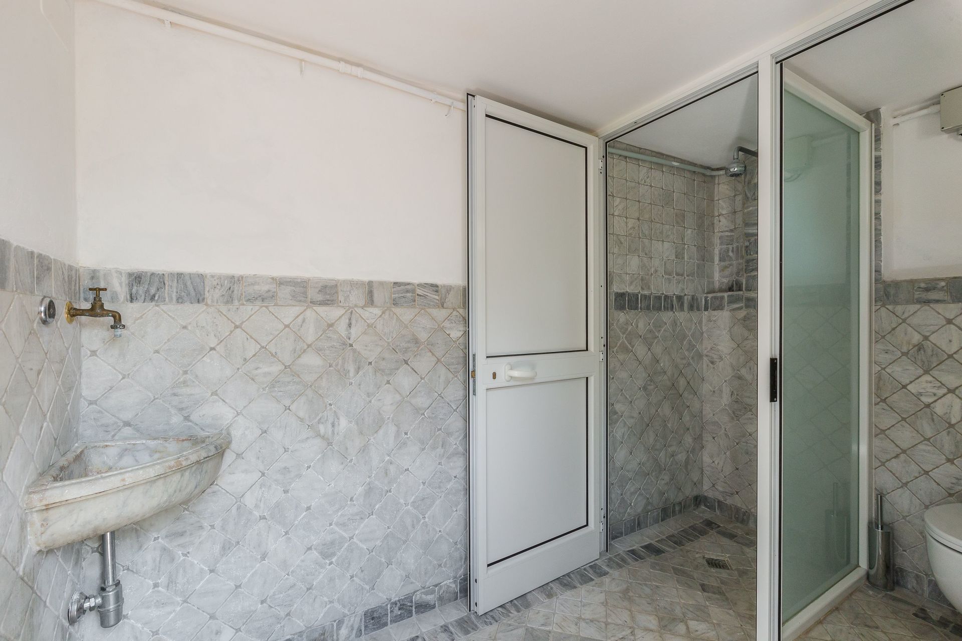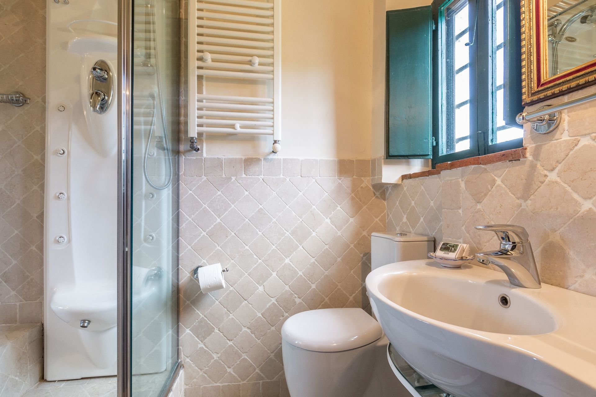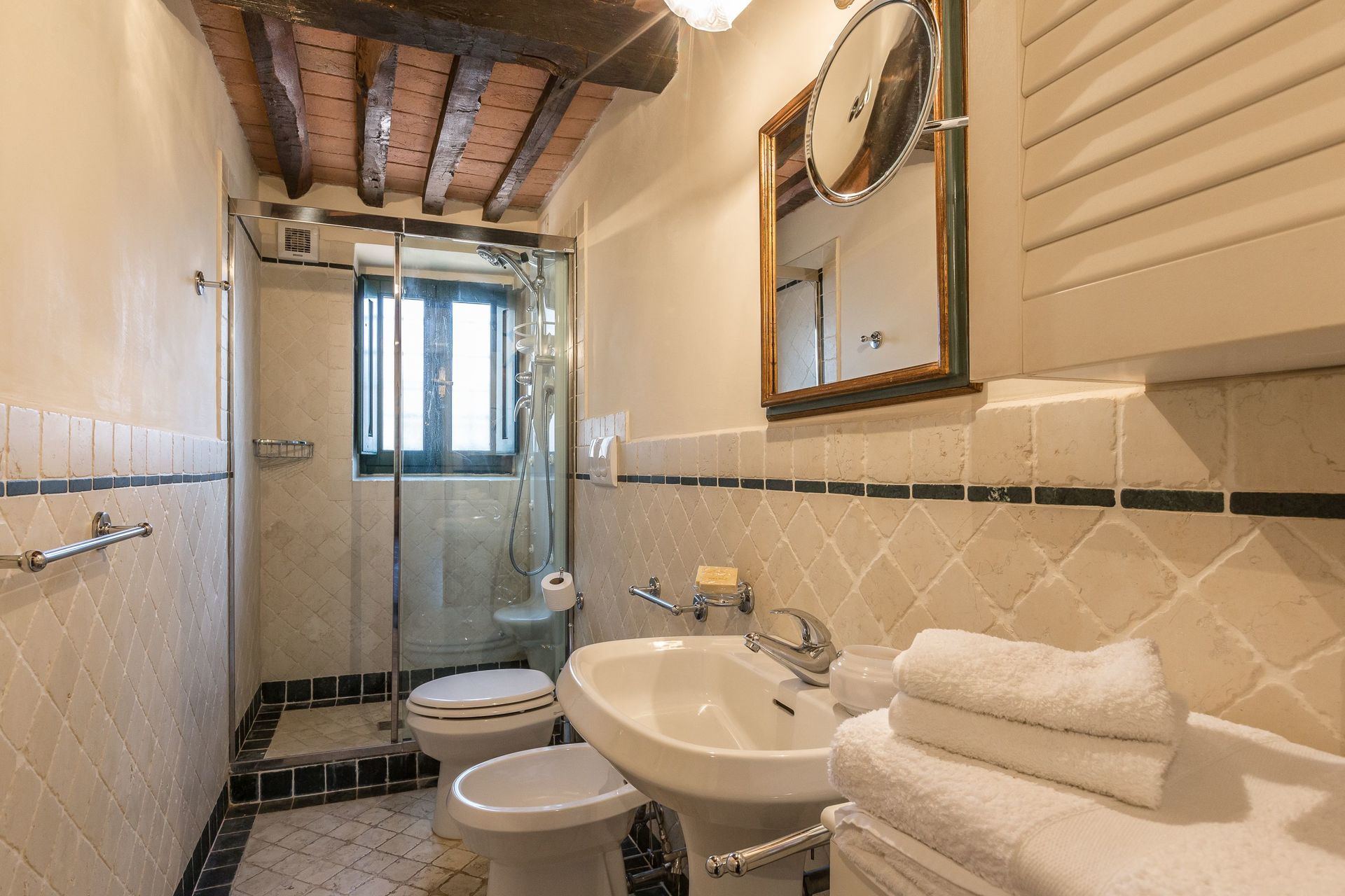 Bathroom: basin, toilet, bidet, bathtub, shower.