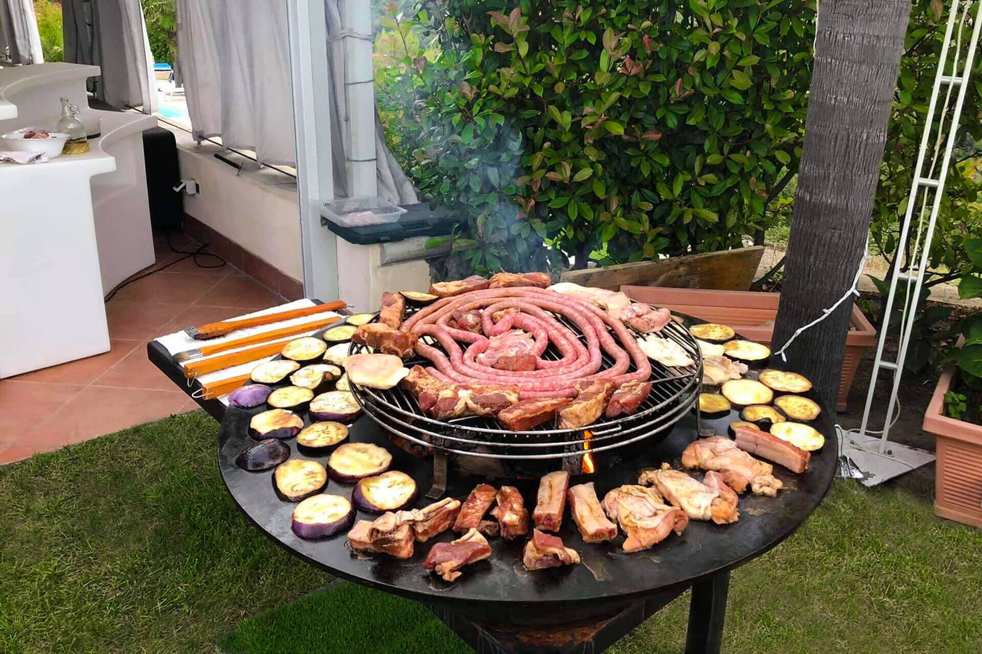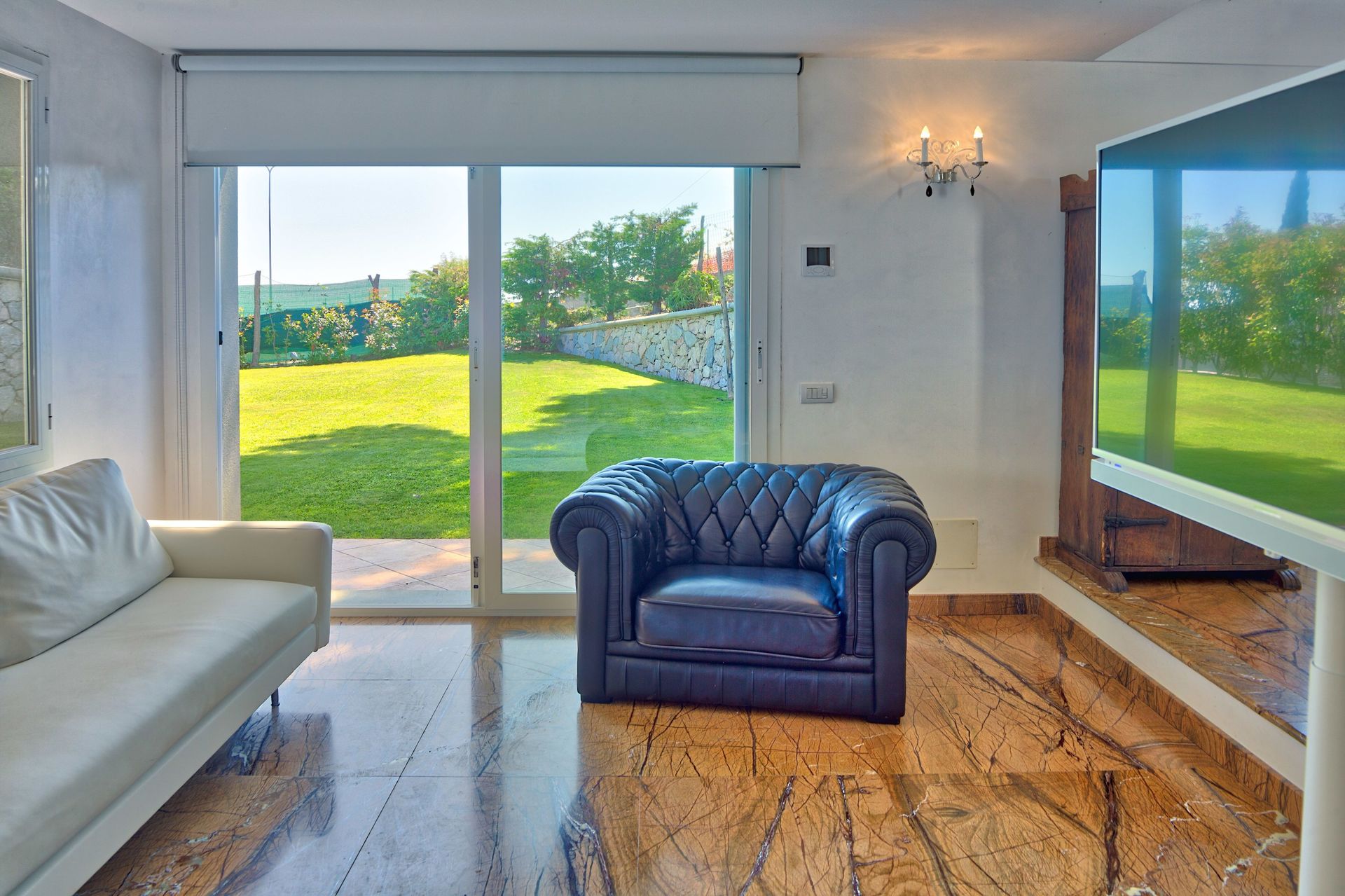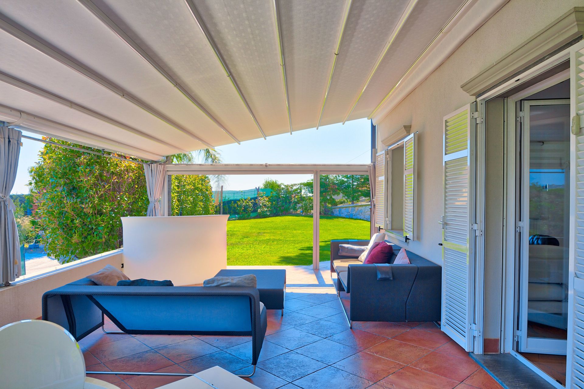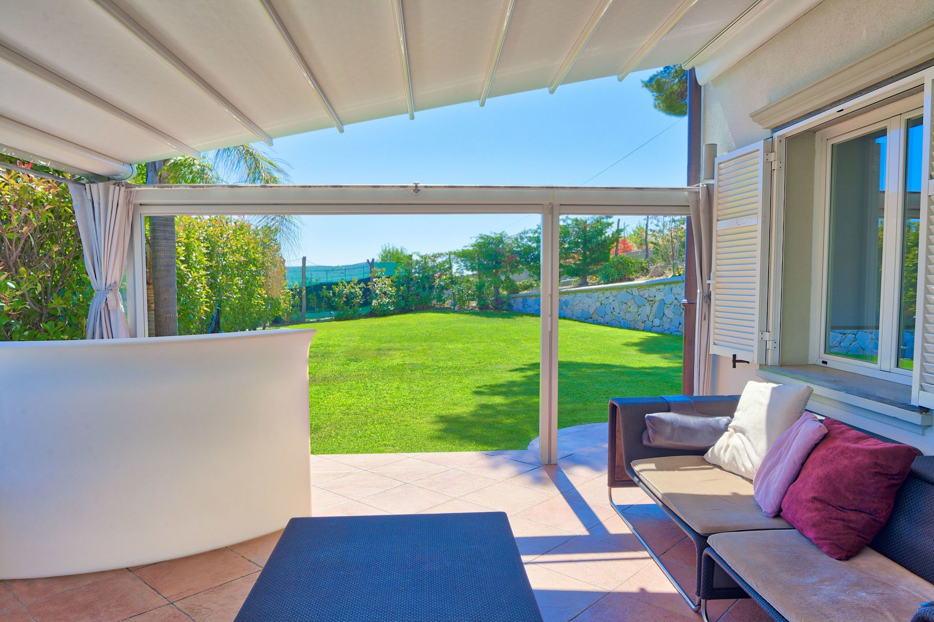 First floor: a very spacious kitchen + living room with dining table and chairs, sofa. Direct access to garden and to the large terrace, which has electrically controlled sunroof, lounge furniture and grill. On the first floor, there is a large bathroom with a double shower.