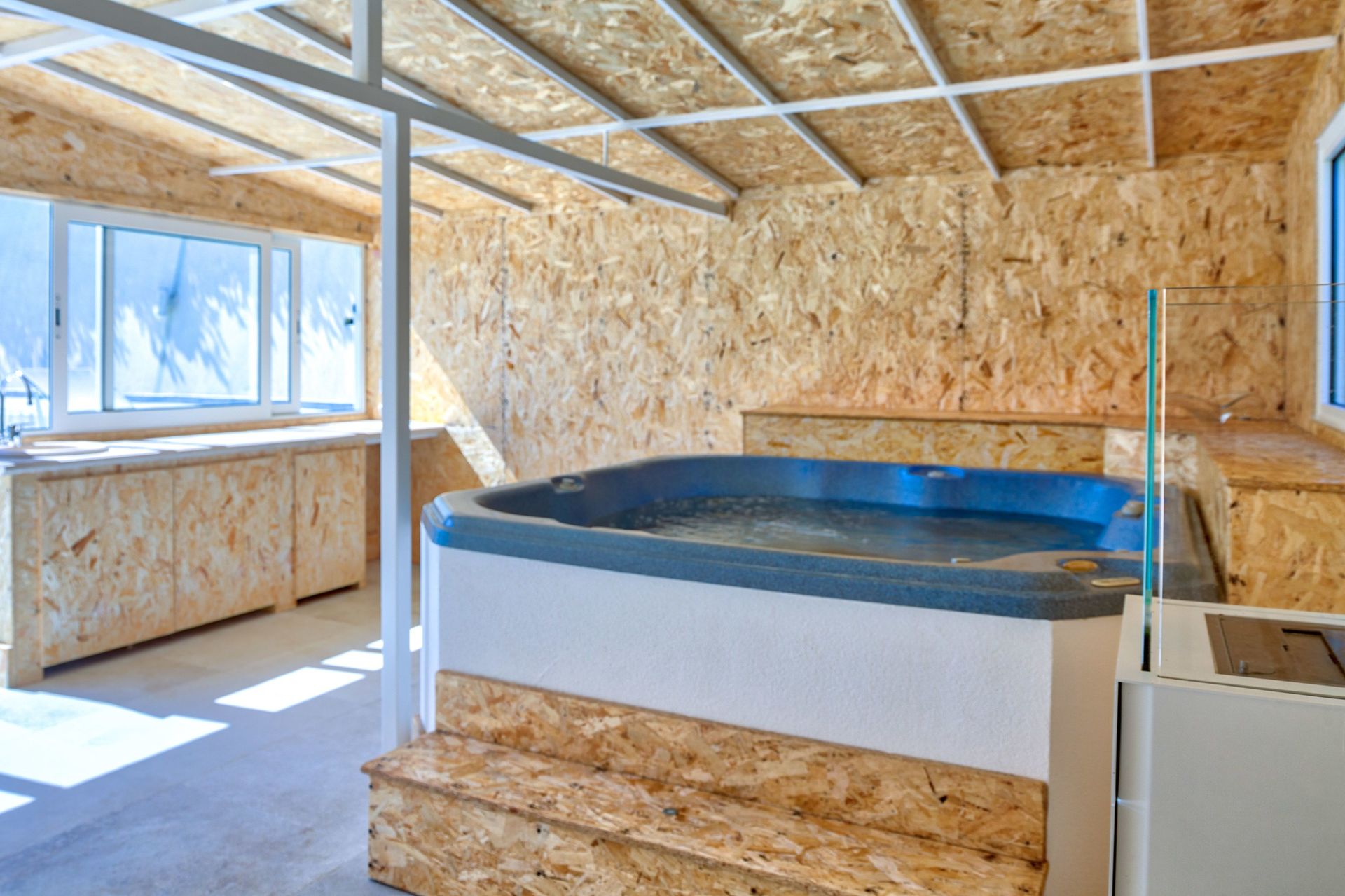 JACUZZI HOT-TUB in the wooden house, next to the swimming pool:
