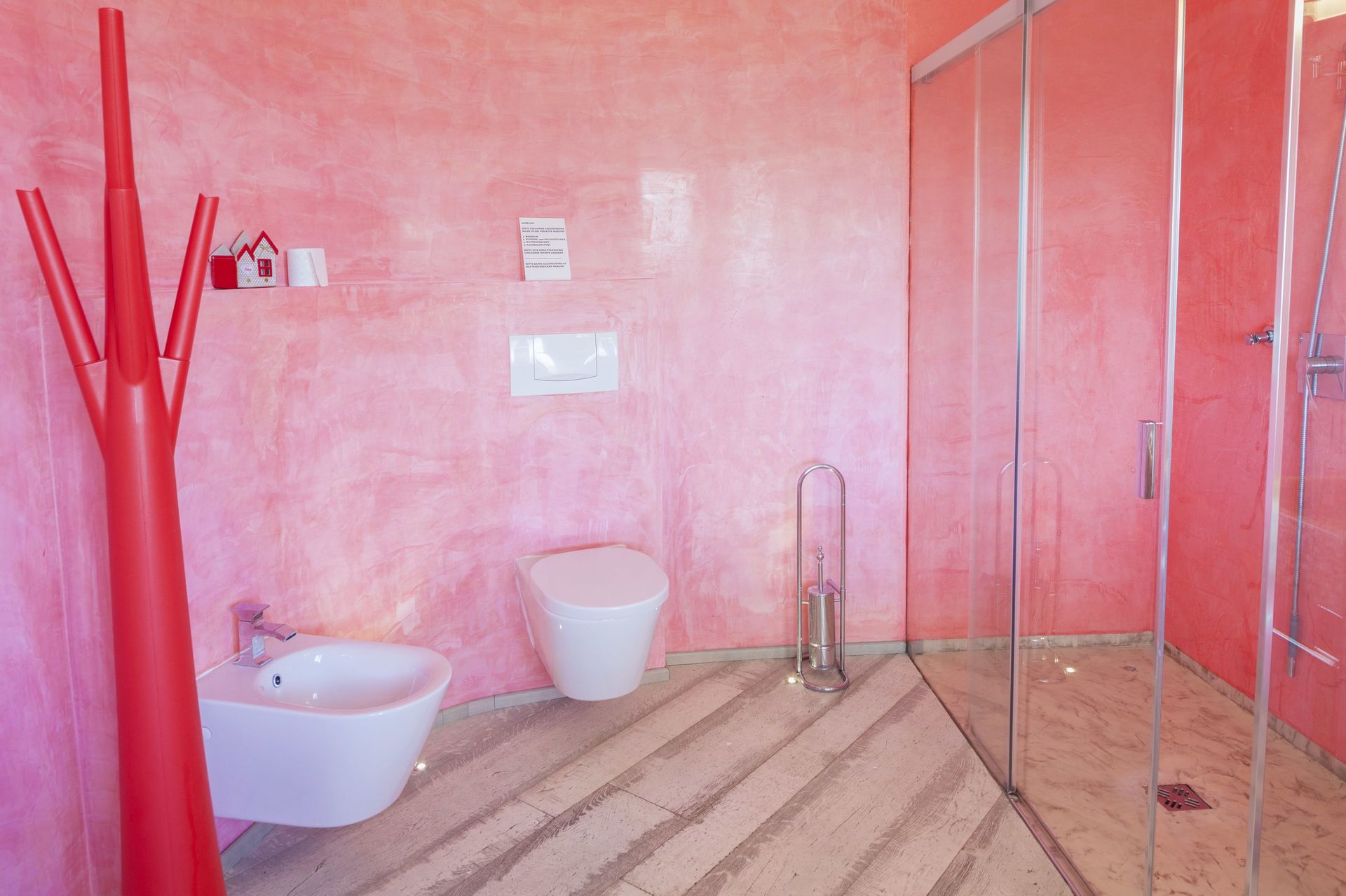Bathroom with shower for two people, toilet, bidet, basin.