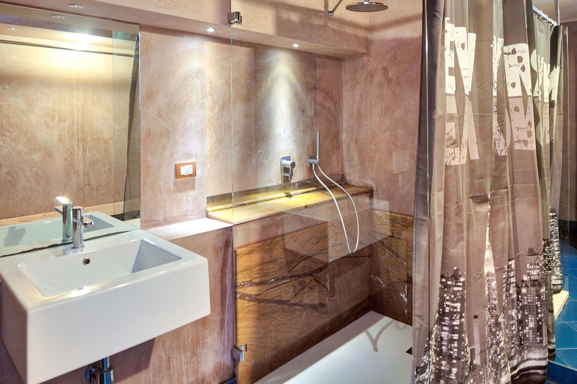 Bathroom with shower, basin, toilet, bidet.