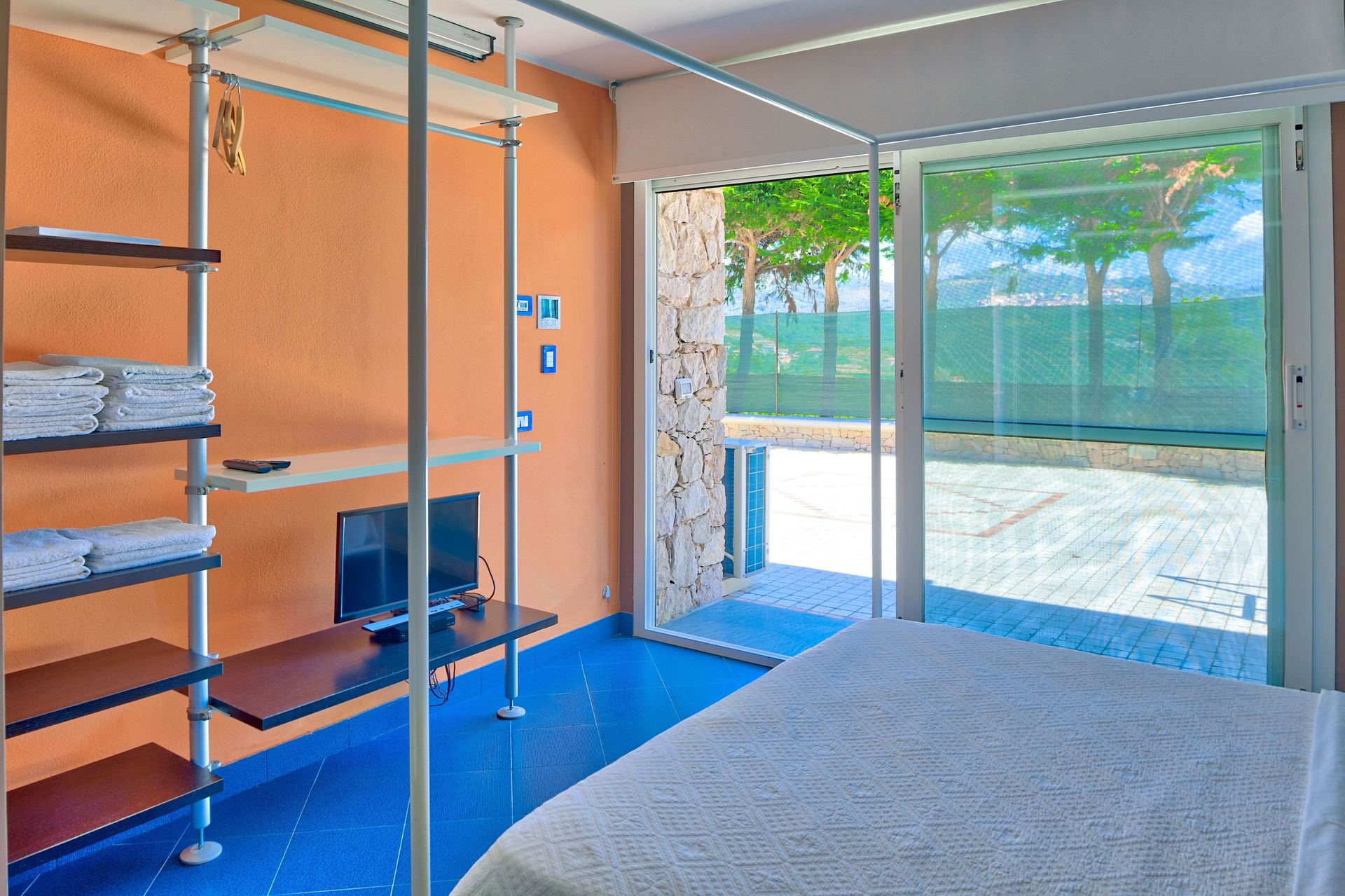 The second double bedroom, with Satellite TV, is separated from the first bedroom by a sliding glass door. The second bedroom has direct entrance/exit from/to the garden.