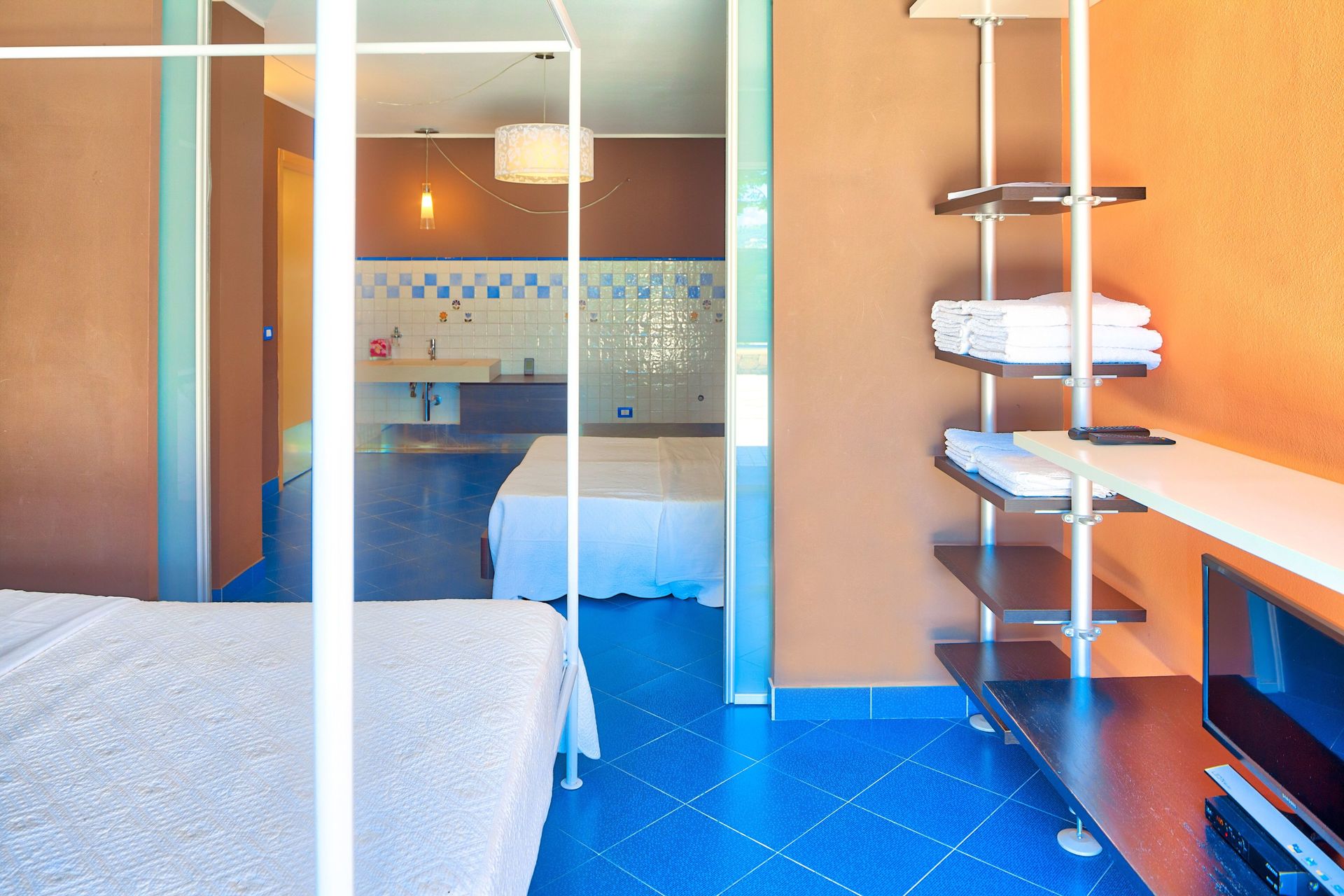 Door and corridor that lead to the first bedroom, with canopy double bed, Satellite TV, washbasin, fridge and microwave, just for simple meals. (Next to the basin, behind a door there is a small laundry with washing machine, dryer, iron and ironing board.)