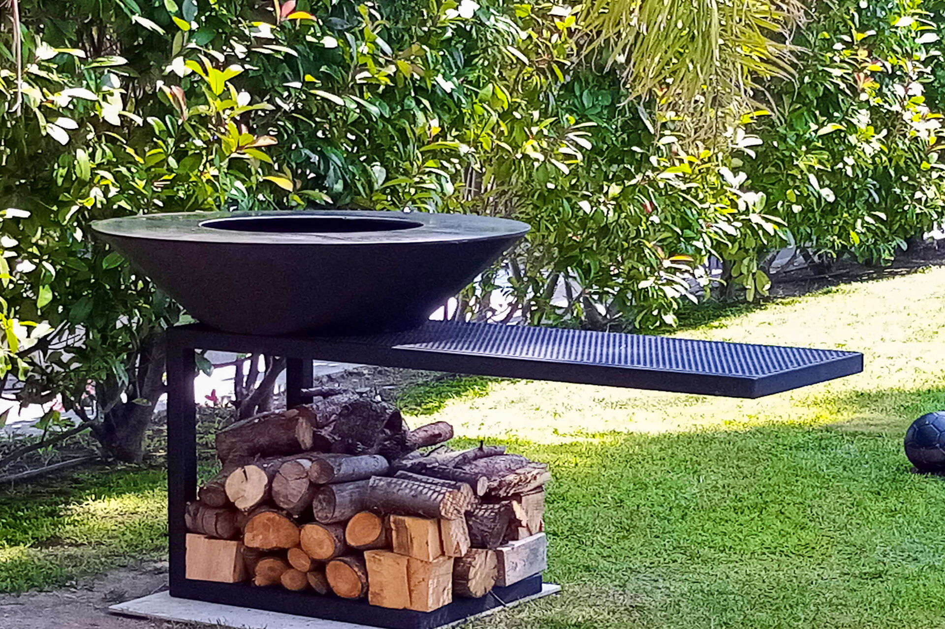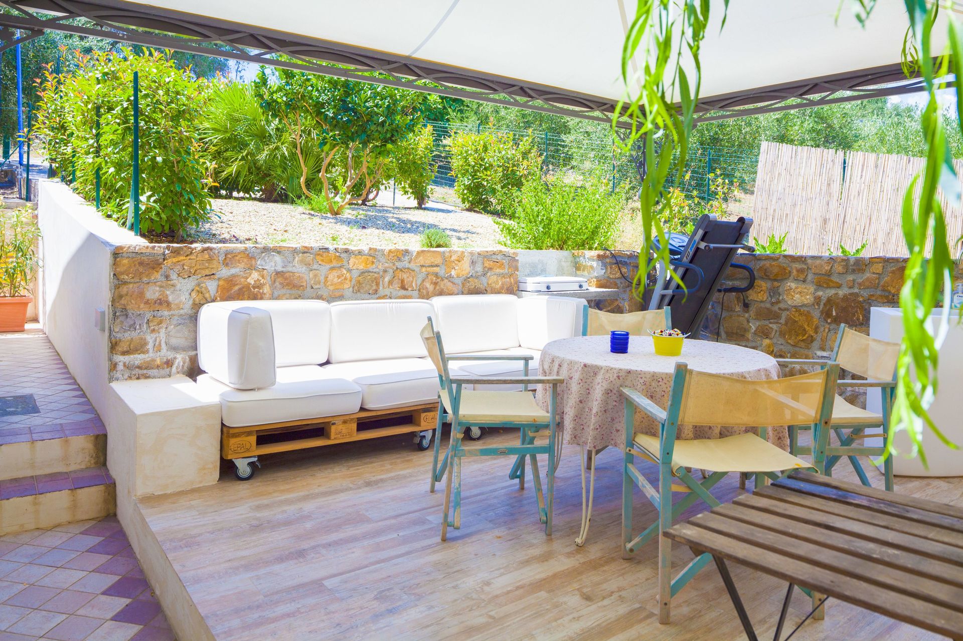 In front of the annex there is a patio with table, chairs, couch, grill.
