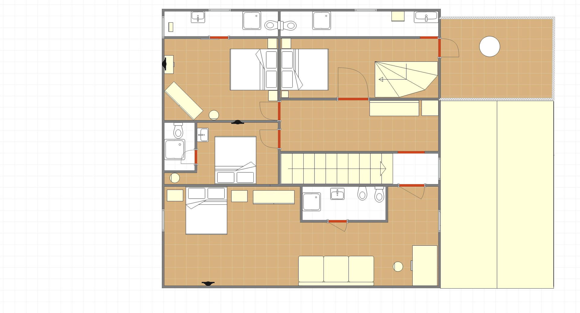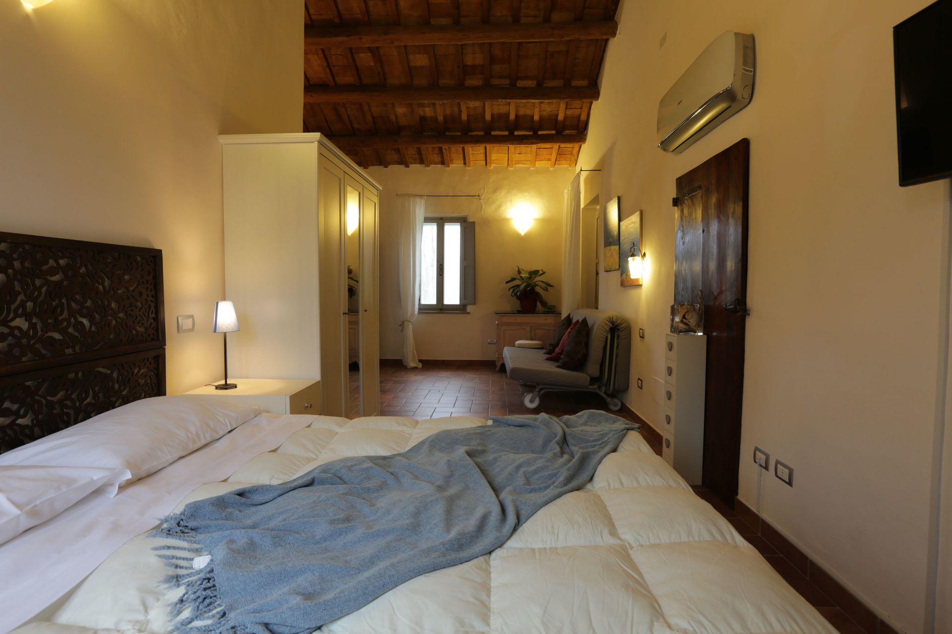 Bedroom + Ensuite Bathroom 4 (20 m2): double bed (length: 190m, width: 160m), single bed (length: 190m, width: 80m), air conditioning, mosquito net, television, working desk, toilet, shower, hairdryer, exit to the balcony.