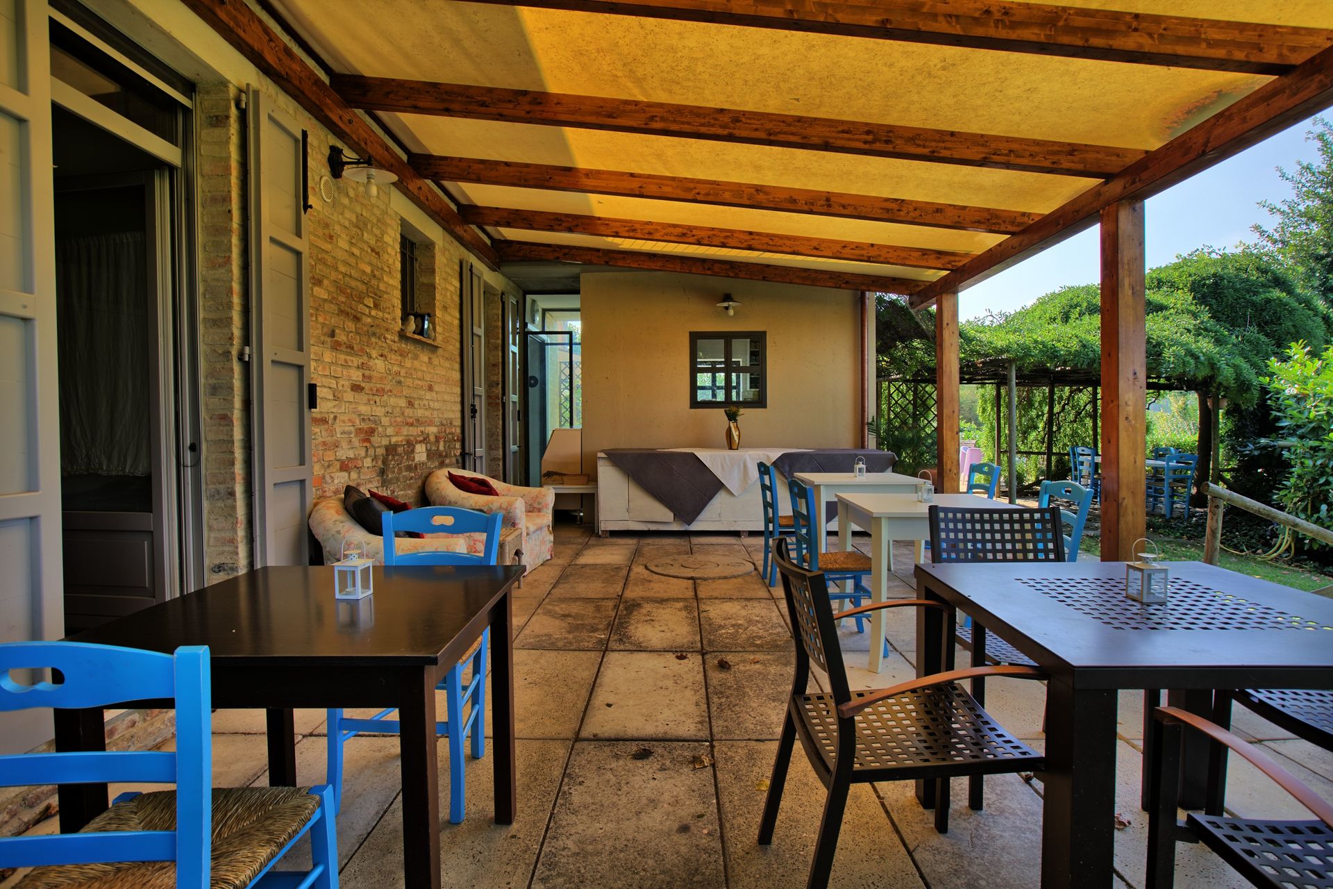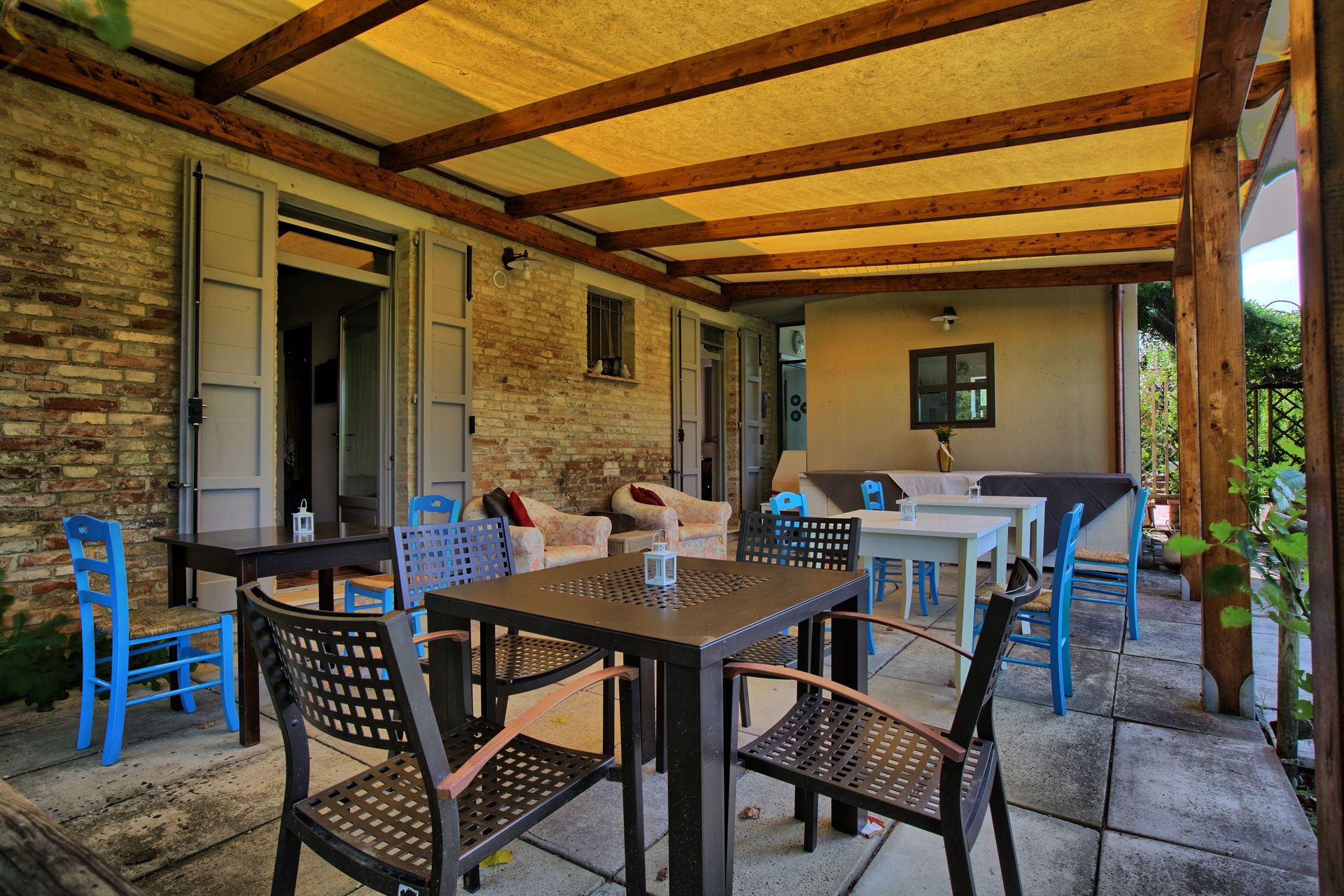 Patio (60 m2): al fresco dining, four dining tables (people: 20), barbecue, WIFI internet, garden furniture, terrace furniture.