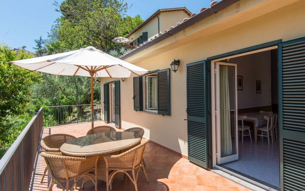 The Podere is situated in a lovely hilly landscape on the outskirts of Collevecchio (400 m above sea level) and 50 km from Rome (30min by car or train). It's in a wonderful position on the grounds of a 10 ha farm, but all the necessary services are within a short distance. The swimming pool with 2 showers (hot water) is for exclusive use of the guests and it is in panoramic position among oleander, palm and citrus trees. It has been totally renovated and consists of a main villa with 2 of our apartments and the owner's apartment and several outbuildings where there are 2 more apartments. All nicely furnished in country style, independent entrance and outdoor private area to dine al fresco. Inside the same grounds there are 2 detached houses: Il Melograno situated in panoramic position above the swimming pool and with a large private terrace, 33 m2 and Le Querce situated in a more secluded and panoramic position 30 m from the swimming pool, surrounded by a 300 m2 natural, enclosed garden with trees. Beautiful, rustic, comfortable farm estate "Il Podere", surrounded by trees. In a secluded, quiet, sunny position. For shared use: property (fenced), swimming pool fenced (6 x 14 m, depth 100 - 160 cm, 30.05.-30.09.). Shower/WC in the pool area, outdoor shower, garden furniture. In the complex: internet access, WiFi. Parking on the premises. Supermarket, restaurant 50 m, bus stop 100 m, railway station "Collevecchio" 4 km. Please note: animals in the neighbourhood.