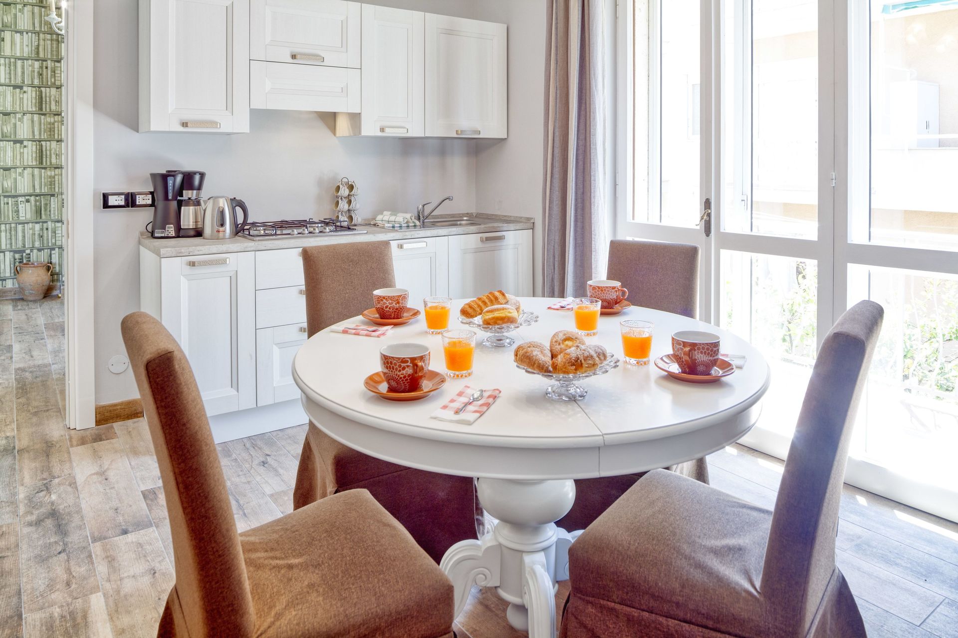 Kitchen + living room (15 m2): well equipped kitchen, dining table (people: 5), dishwasher, fridge, stove top, italian coffee machine, american coffee machine, sofa (people: 3), WIFI internet, internet, highchair, exit to the balcony.