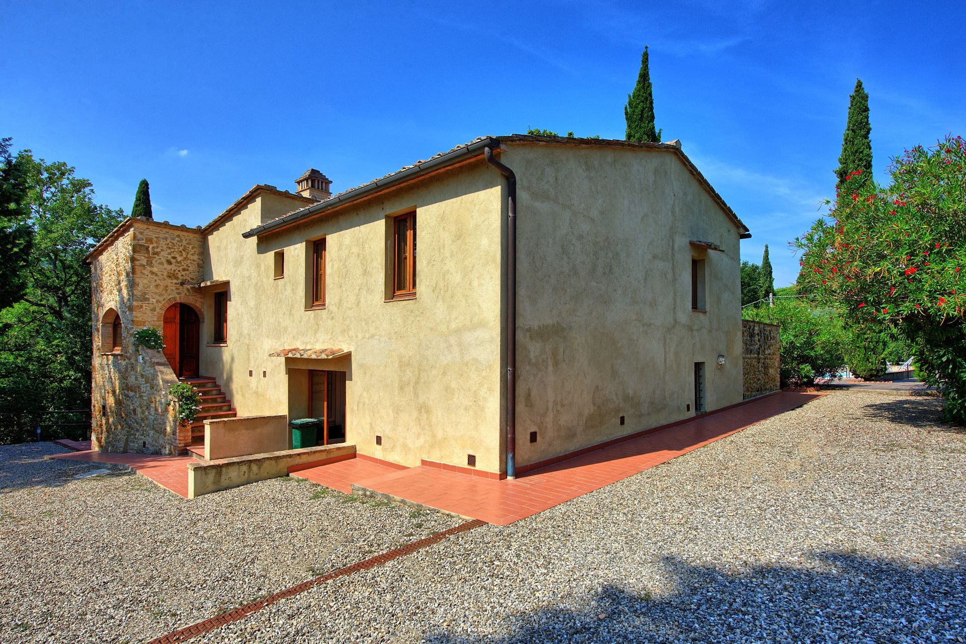 Distances: San Gimignano (shops of all kinds) less than 2 km, Poggibonsi 13 km, Volterra 30 km, Siena 40 km, Florence 50 km, Pisa and Lucca are about 85 km away. The Chianti Classico wine zone lies within a 20 - 50 km radius.