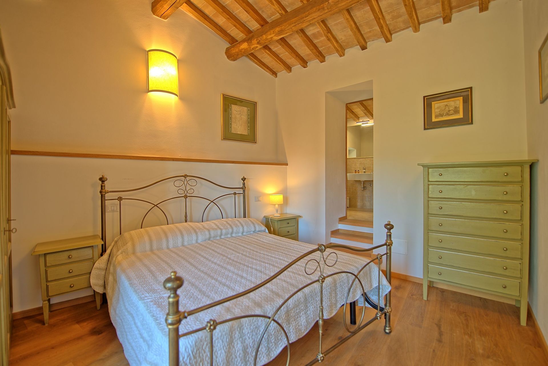 First floor: bedroom with double bed (air conditioning), bathroom with shower, bedroom with double bed (air conditioning) with private bathroom with shower.