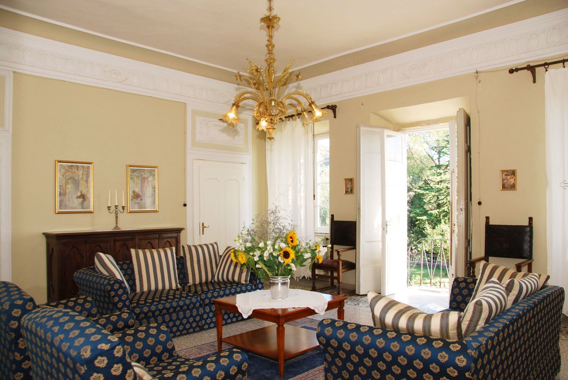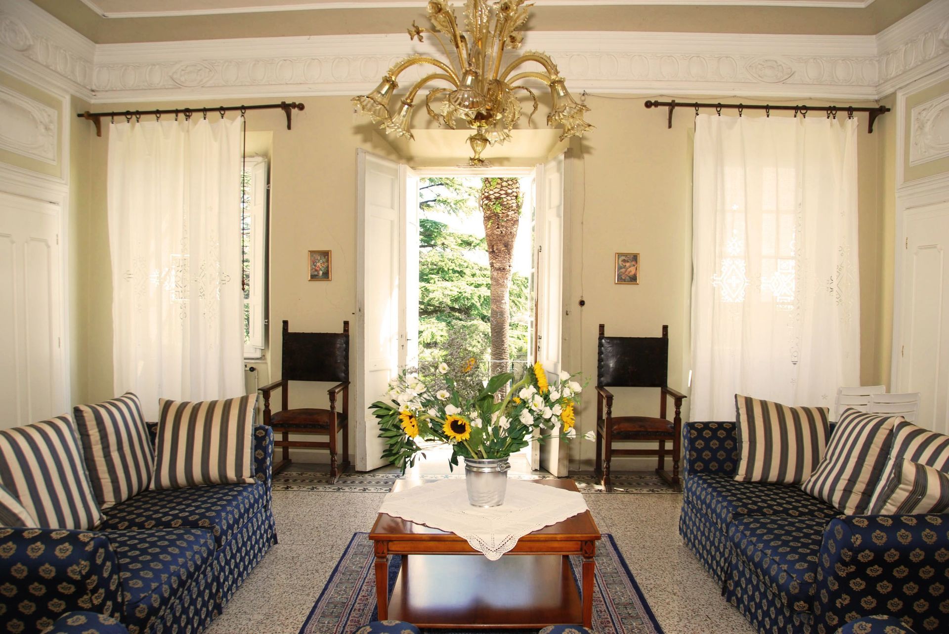 Living room 1: two sofas (people: 4), two armchairs, exit to the garden.
