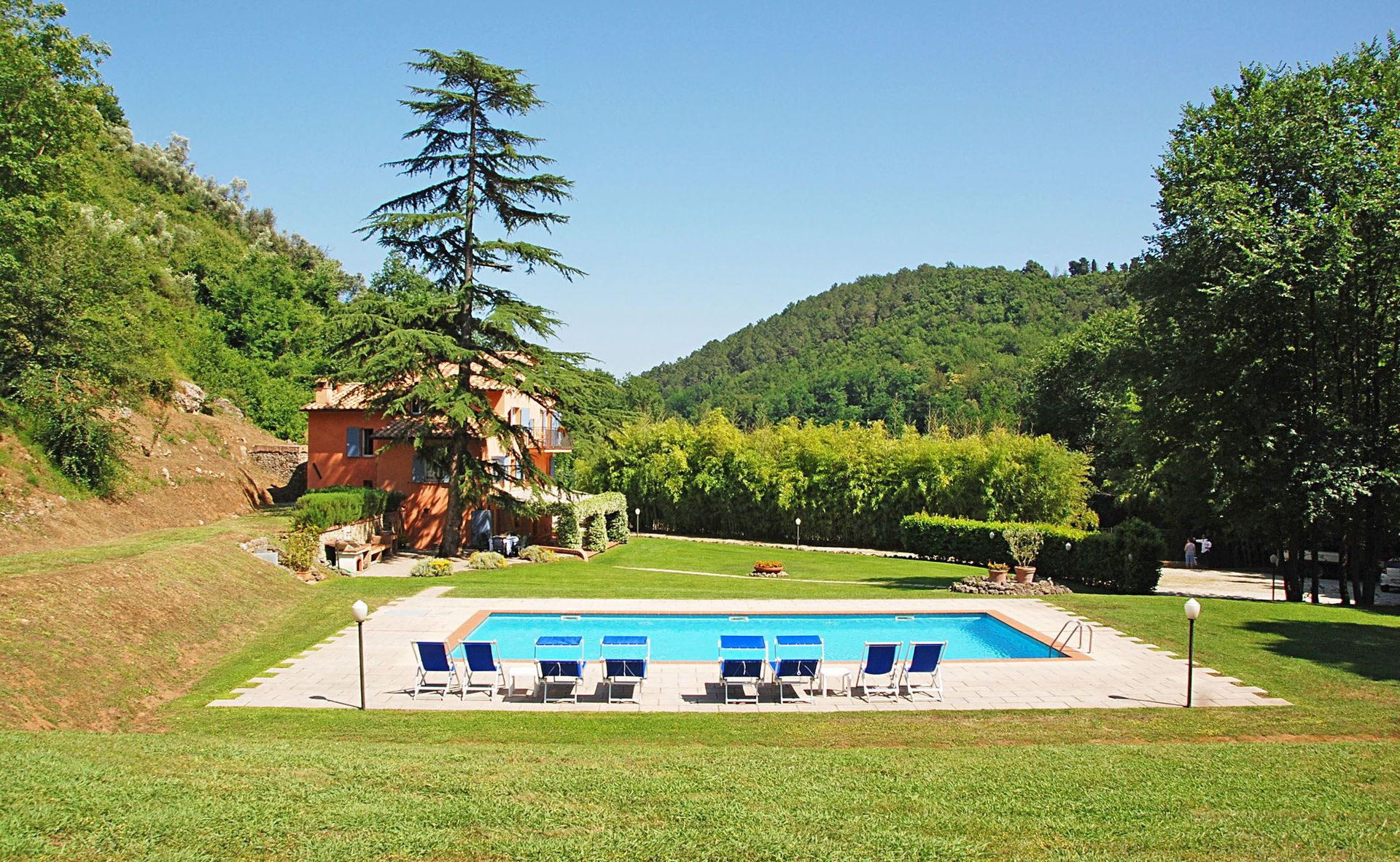 This property is located in a valley only 2 kms from the centre of Camaiore, a lovely small town 10 kms from the beaches of Versilia. The position is very quiet. The whole small valley belongs to the same owner, who has restored both La Damigella and Alisso, the other property on the estate we represent in our program. The two properties have their own big garden and total privacy. A particular feature of this property is the very well furnished area between the house and the pool, equipped with a built-in barbecue and ideal for al fresco eating.
