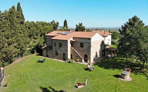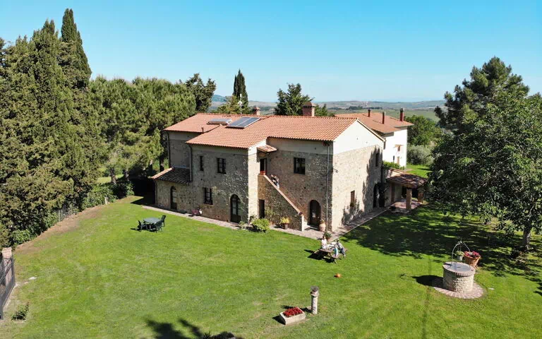 Large working farm "L'Antica Quercia", from the 19th century. 2 houses in the residence. 4 apartments in the residence. 6 km from the centre of Pomarance, 20 km from the centre of Volterra, 35 km from the centre of Cecina, on top of a hill, 35 km from the sea. For shared use: property 1 ha (fenced), plants and trees, natural garden, meadow, swimming pool (12 x 6 m, seasonal availability: 14.May. - 15.Oct.). WC in the pool area, children's pool, outdoor shower, hot tub, arbour, garden furniture, barbecue, barbecue house, pool maintenance by the owner/gardener. In the house: reception, washing machine (for shared use, extra). Parking on the premises. Shop 6 km, supermarket 6 km, railway station "Saline Volterra" 10 km, sandy beach "Marina di Cecina" 35 km, indoor swimming pool 16 km. Nearby attractions: Volterra. Local sale of farm products. Please note: the owner lives on the same property.