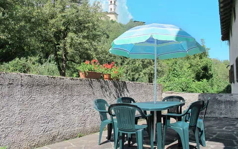 Calceranica Al Lago, Italy is a rustic terraced house "Casa al Mulino" situated at an altitude of 480 meters and surrounded by trees and meadows. The semi-detached, two-story property offers a private, natural-state yard of 340 square meters with a meadow and orchard, perfect for a relaxing vacation rental. It also features a storage room for bicycles and parking for two cars on the premises.