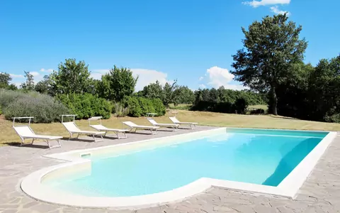 At "Casale Vitello" vacation rental, a rustic and comfortable detached country house surrounded by trees and fields, you can enjoy amenities such as a swimming pool, a yard, internet Wi-Fi, and parking facilities. This secluded property is situated on a slope, offering a serene escape in the countryside.