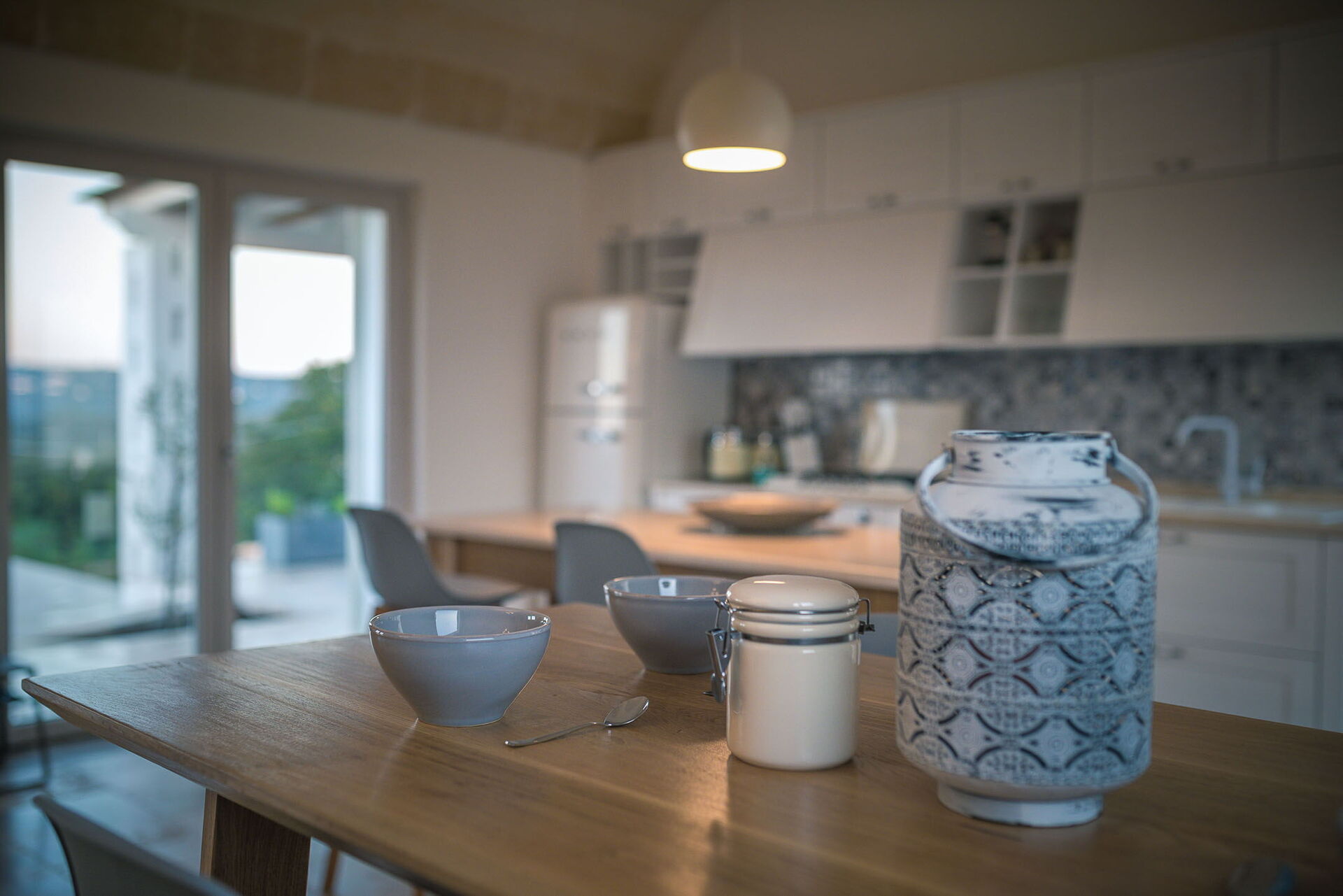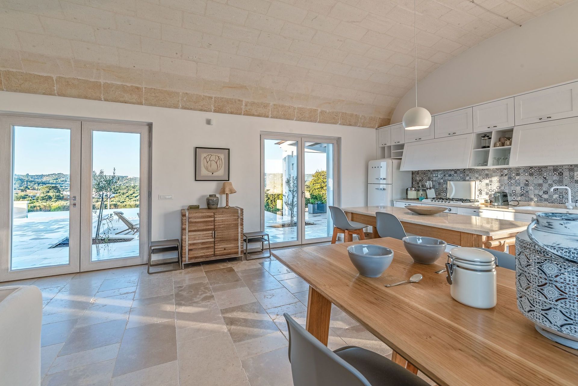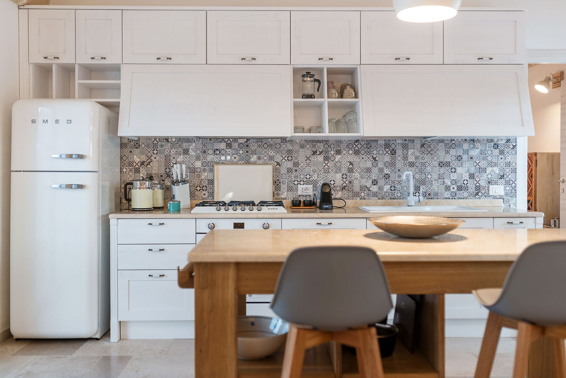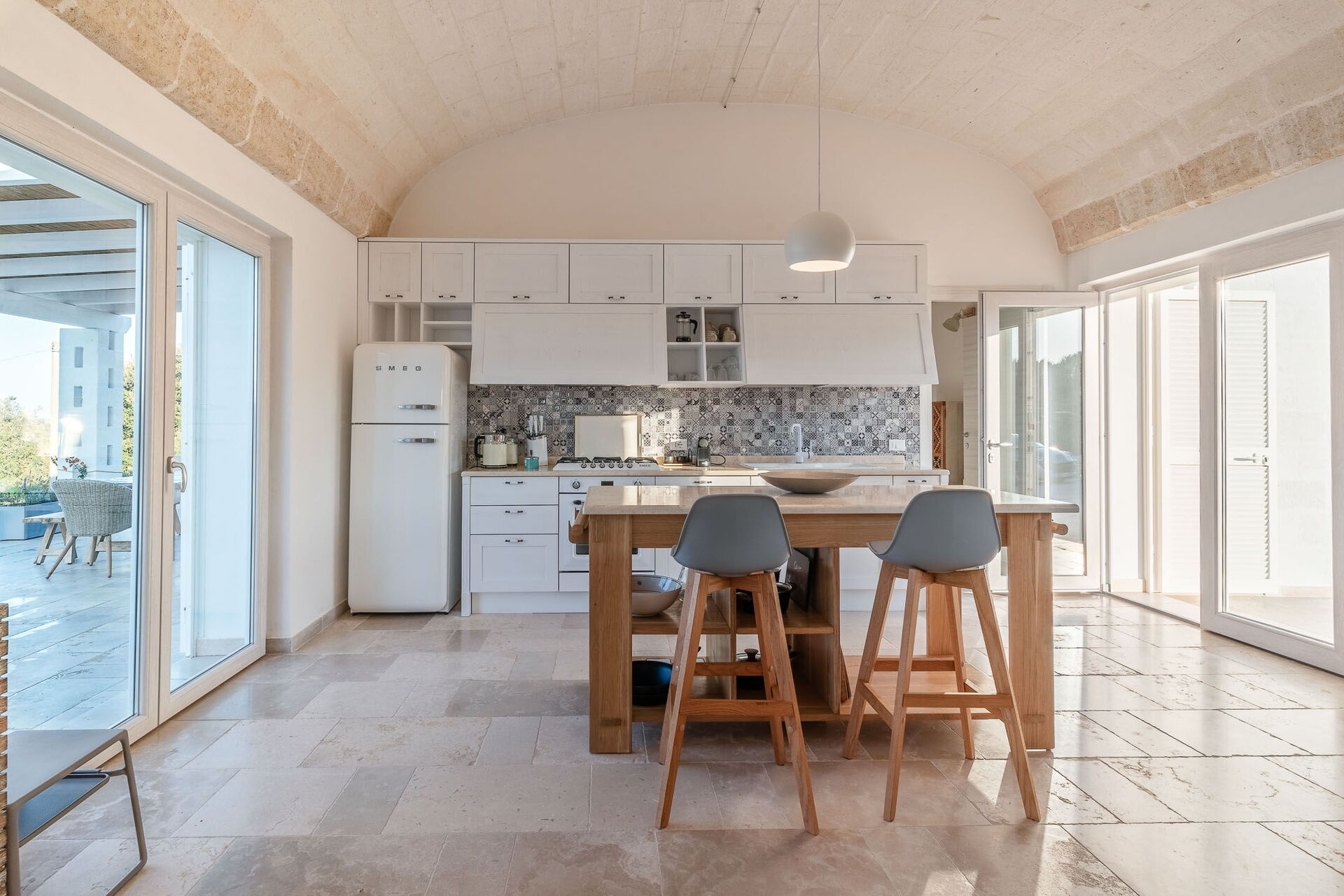 The kitchen is tastefully done with white fitted units, Smeg appliances with large fridge freezer, 5 ringed electric hob and electric oven with extractor fan, all ideal for those who like to cook whilst in their holiday villa. Local produce is readily available at the local stores or on Saturday there is a market in Ostuni.