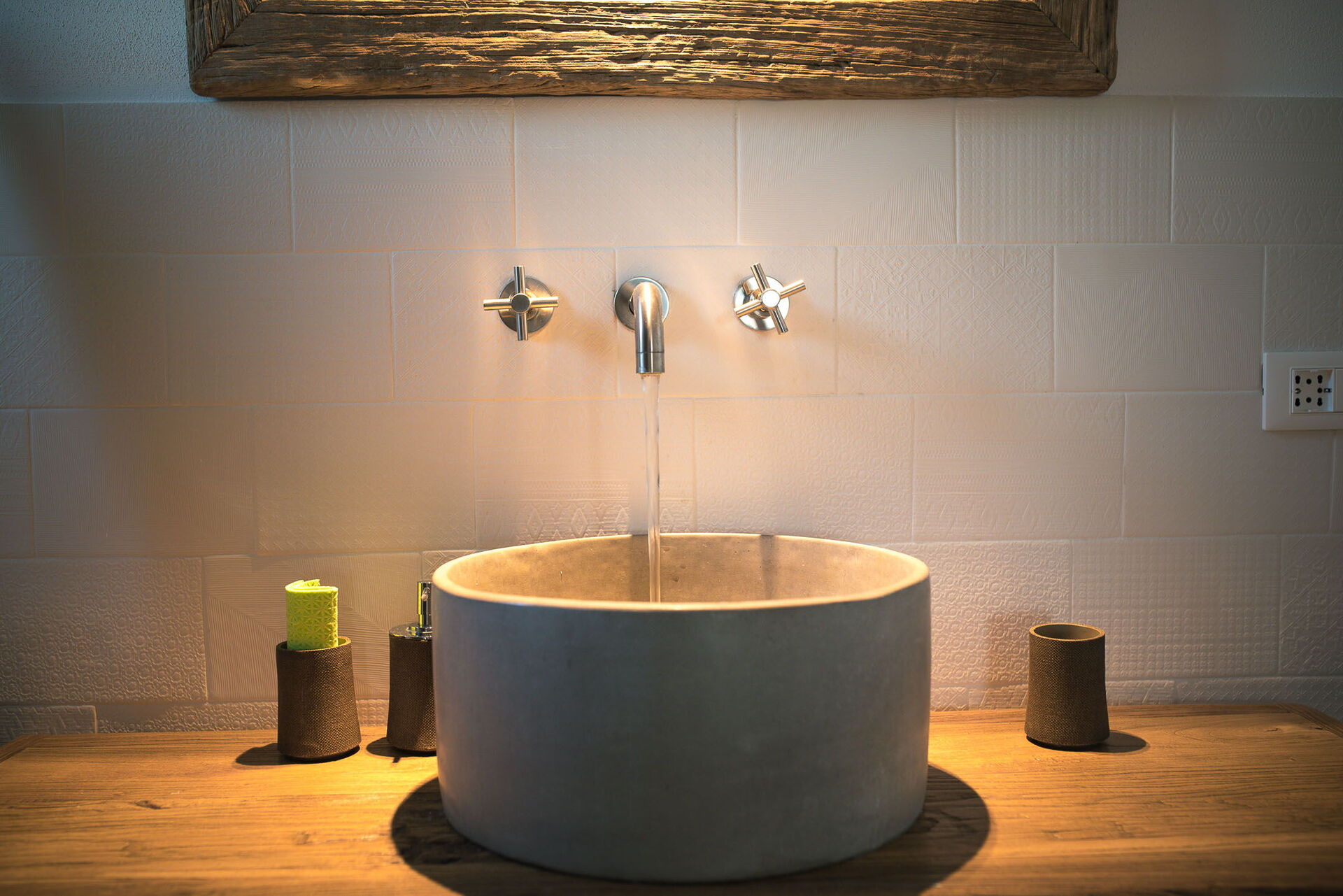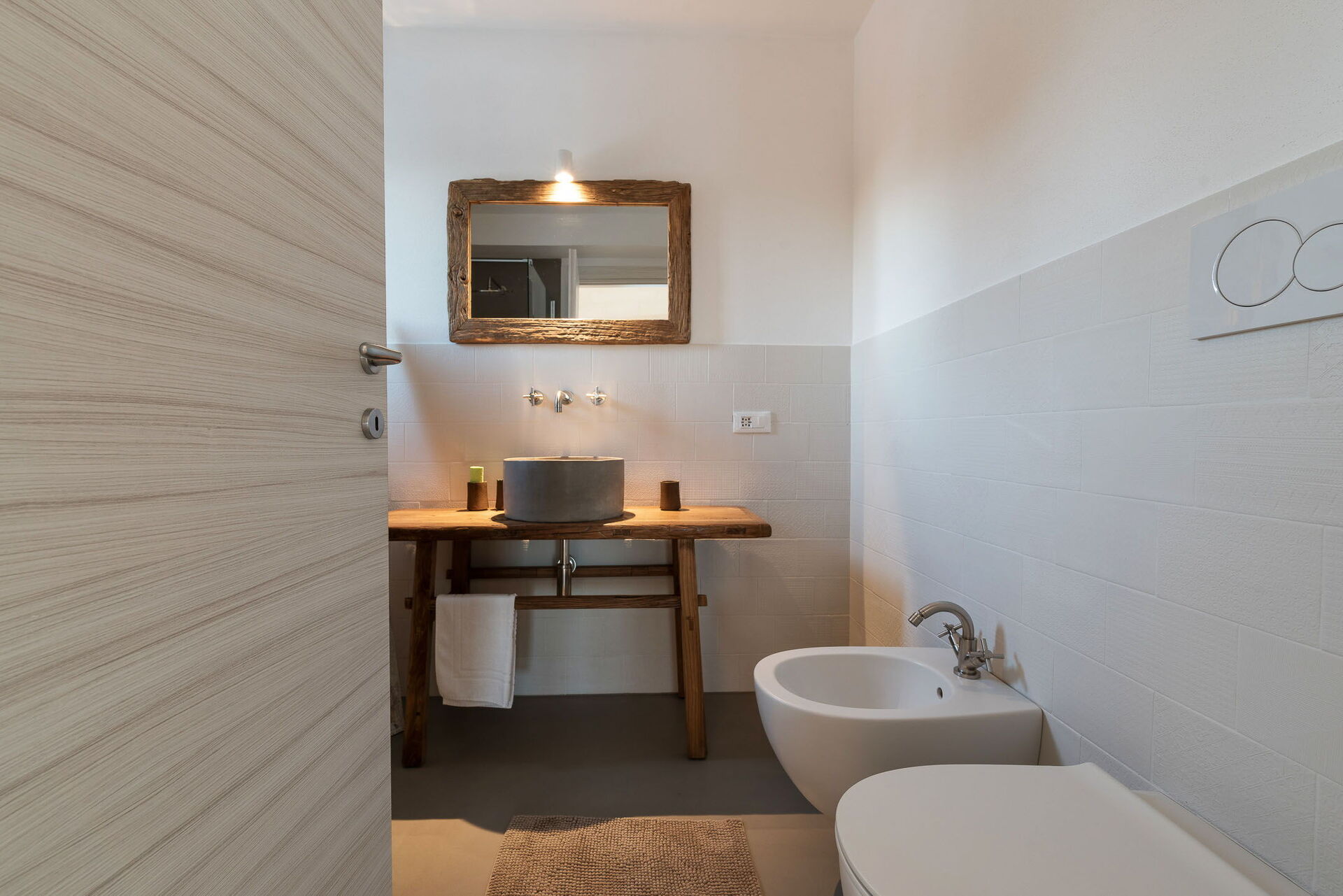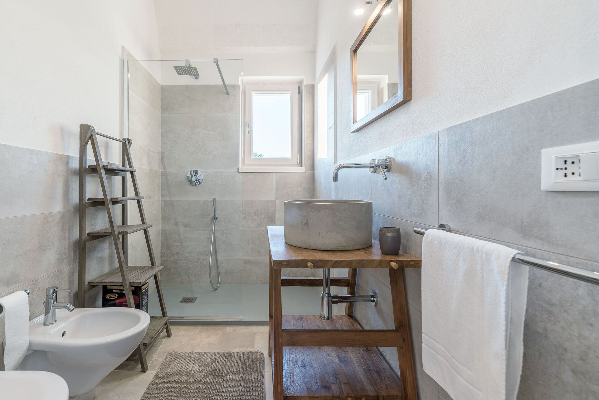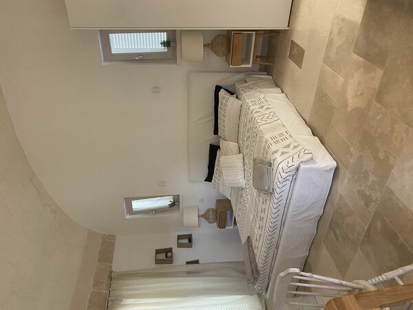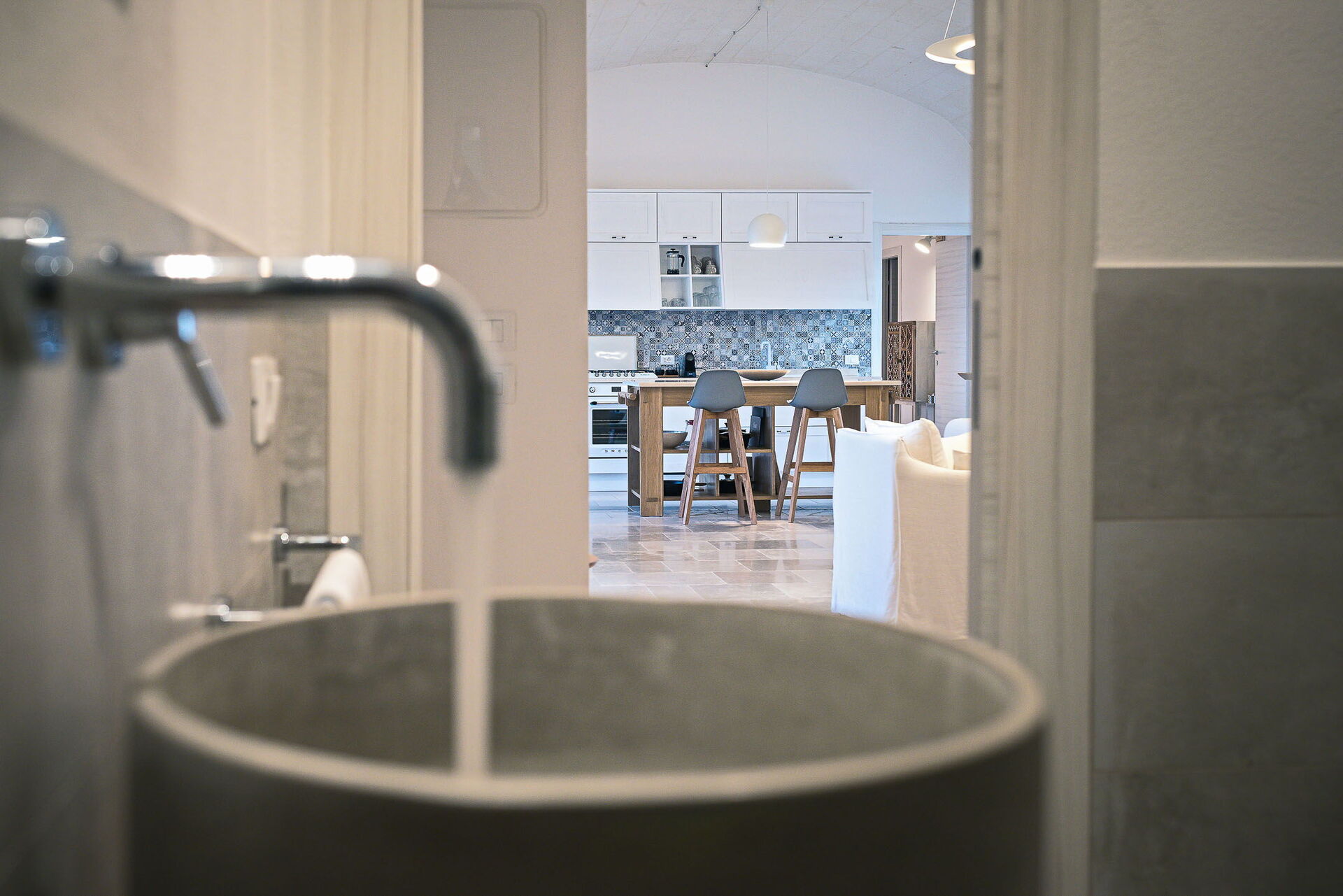 The kitchen is tastefully done with white fitted units, Smeg appliances with large fridge freezer, 5 ringed electric hob and electric oven with extractor fan, all ideal for those who like to cook whilst in their holiday villa. Local produce is readily available at the local stores or on Saturday there is a market in Ostuni.