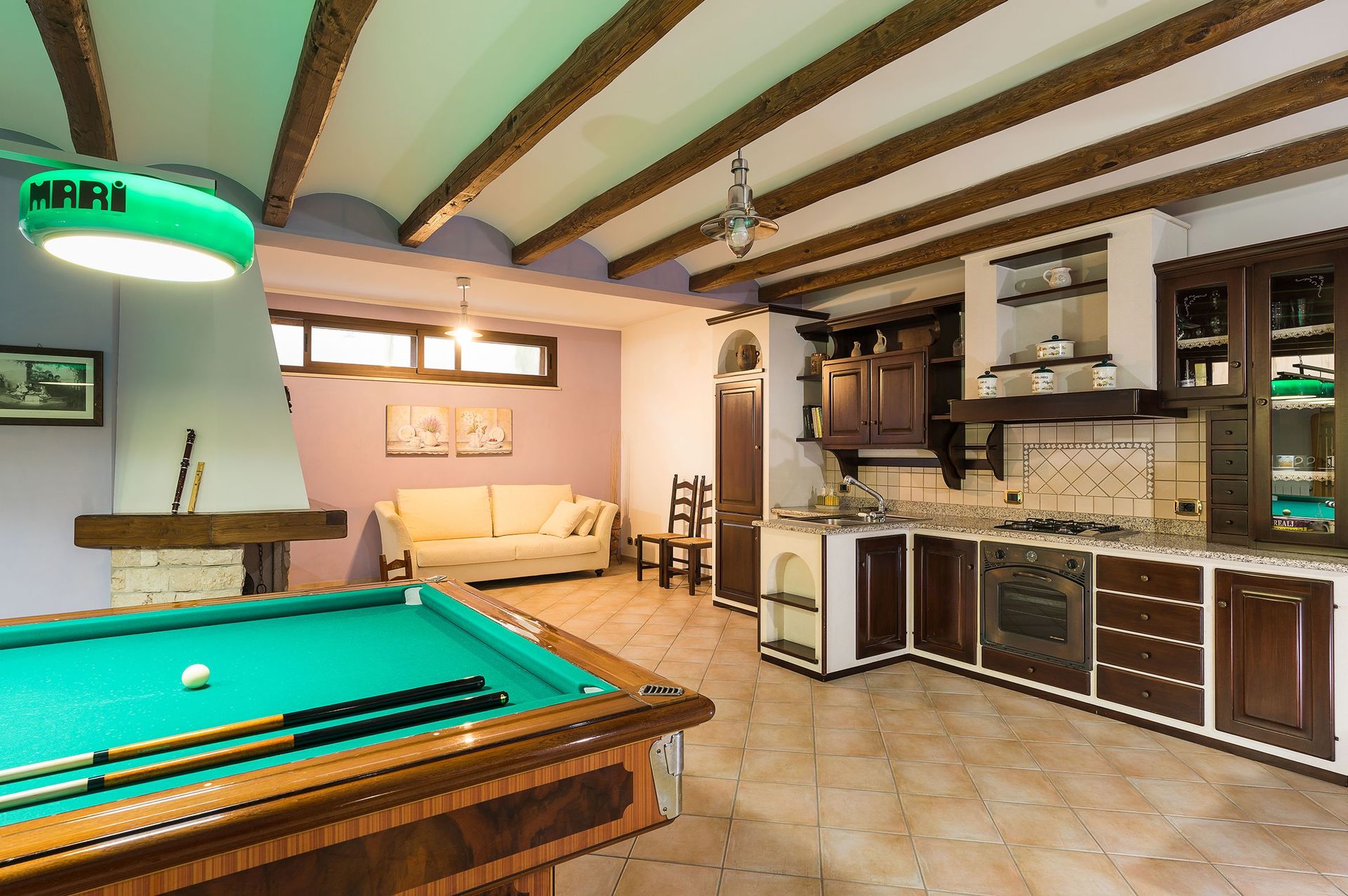 Kitchen + living room: dining table, fridge, freezer, stove top, oven, sofa, fireplace, WIFI internet, television.