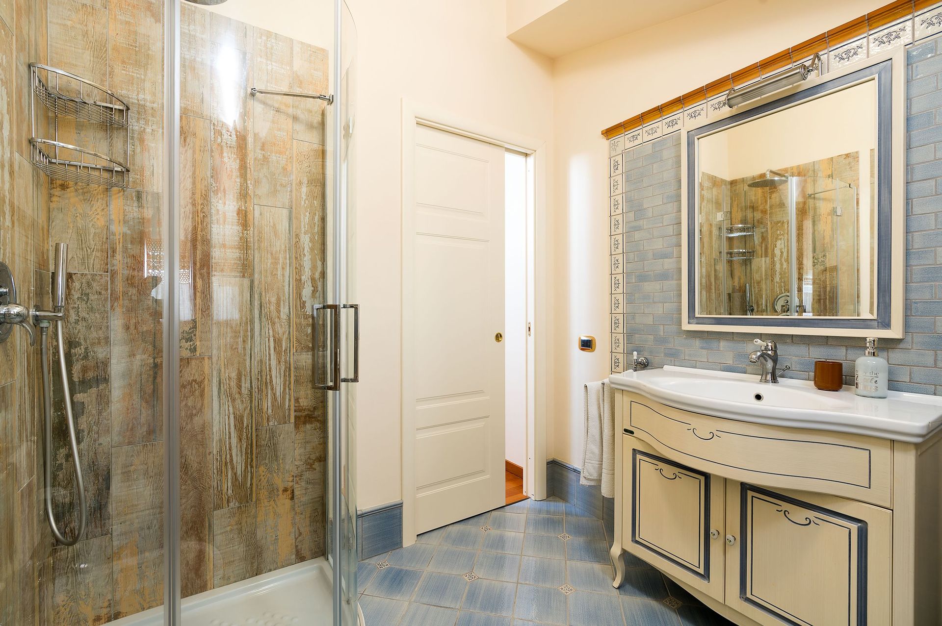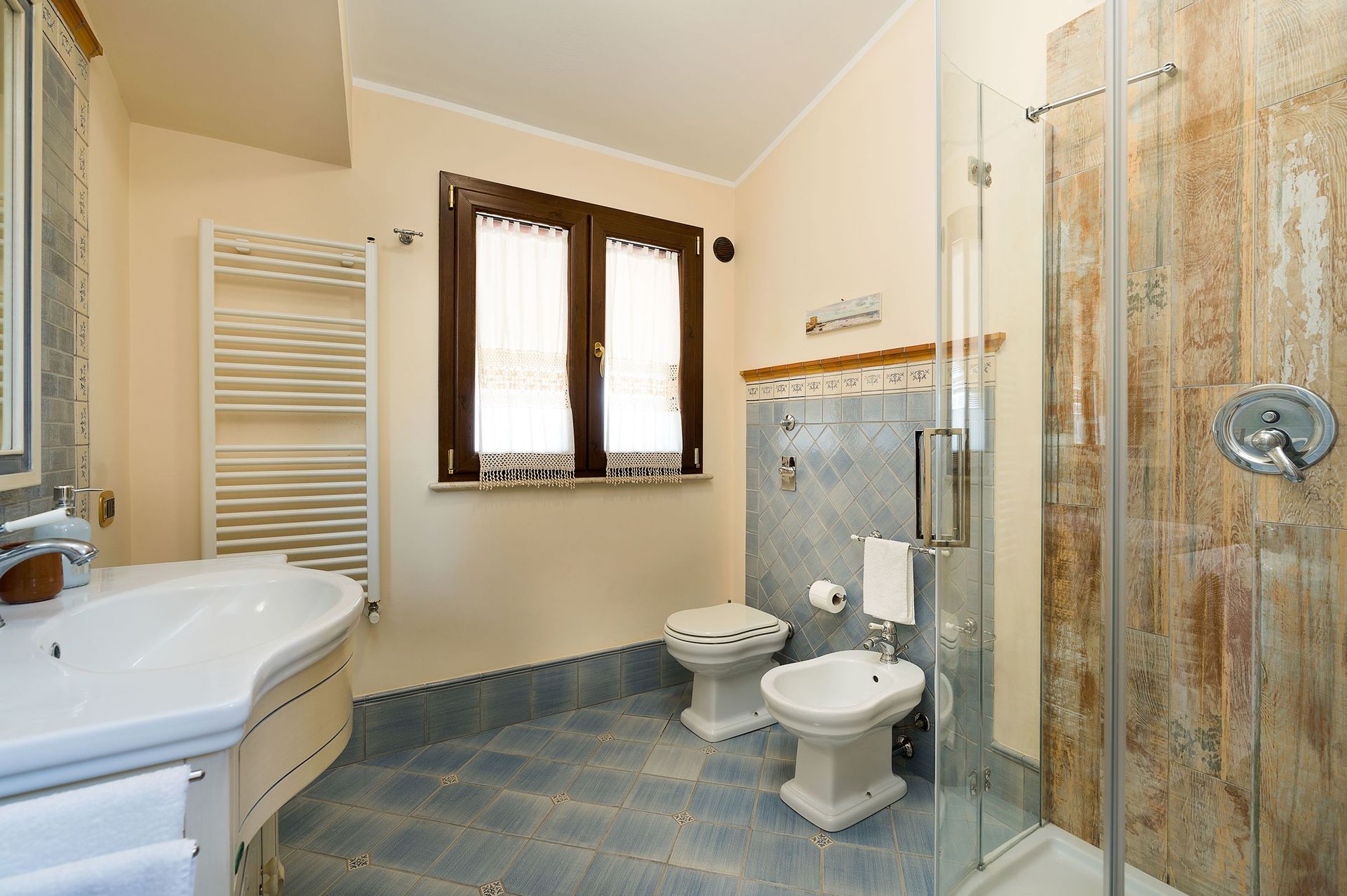 Bathroom: basin, toilet, bidet, shower.