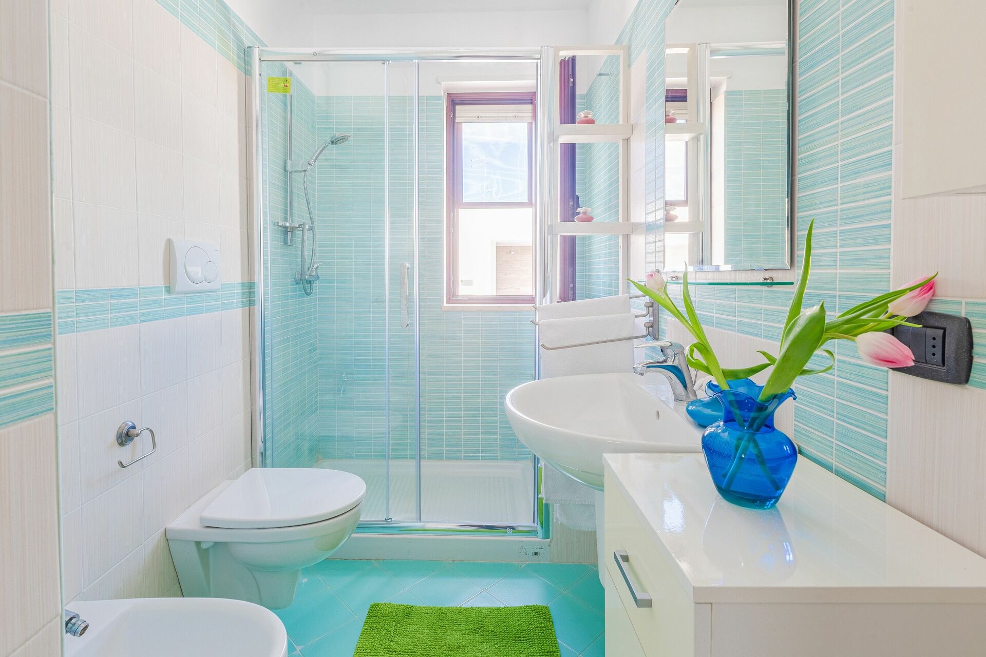 Bathroom: basin, toilet, bidet, shower.