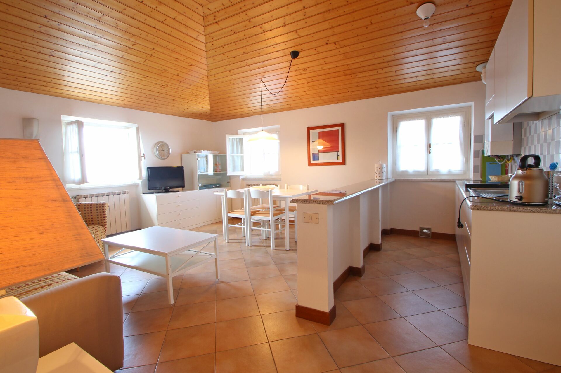The apartment has a sea view and panoramic view of the hamlets and villages, hallway, shower room with window, open kitchen with dining table, living room with pull-out sofa bed and TV, mosquito nets, WiFi.