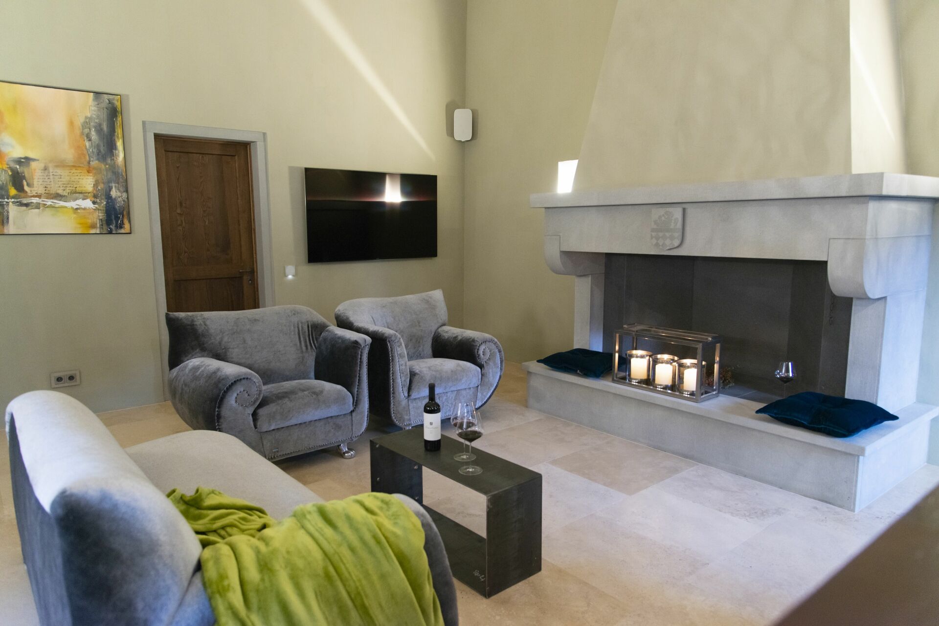 Living room: two sofas (people: 3), two armchairs, fireplace, air conditioning, television.