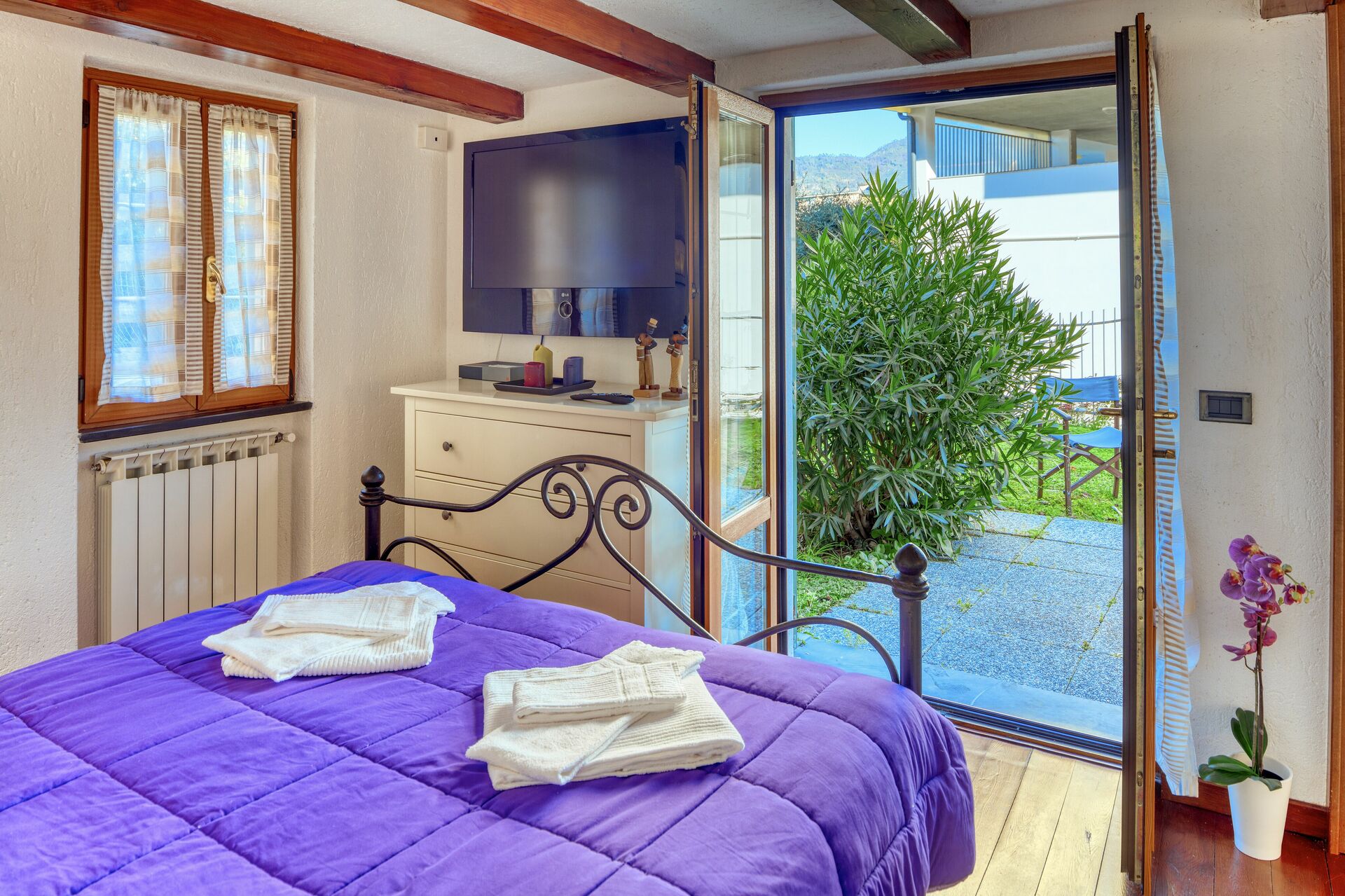 The apartment sleeps two people. The bedroom has a direct exit to garden.