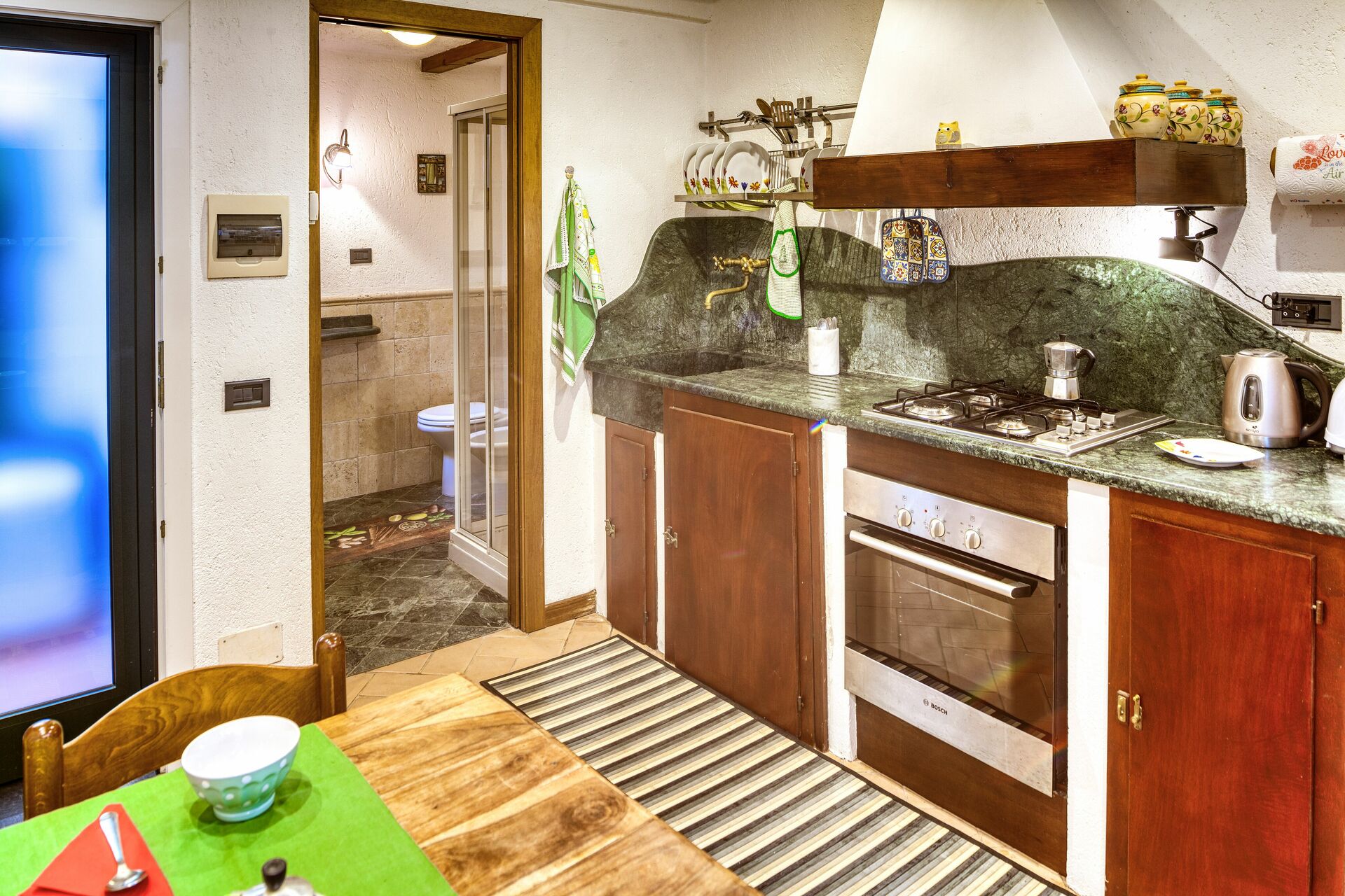 Equipped kitchen, dining table, oven, microwave oven, toaster, Moka coffee maker, kettle.