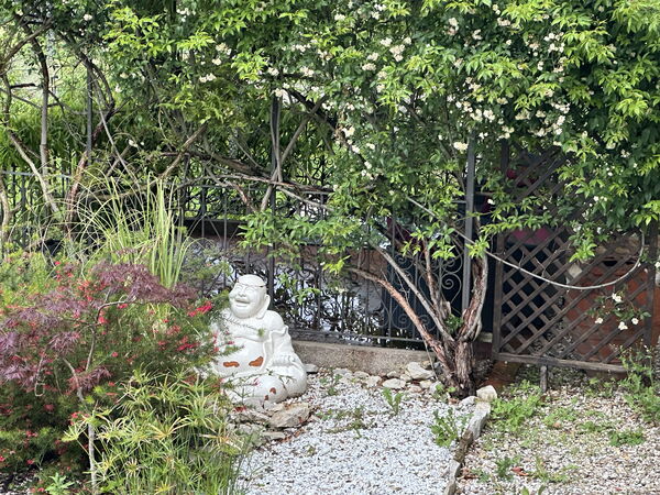 The house is set on two levels, with both floors offering direct access to the garden due to its hillside location.
