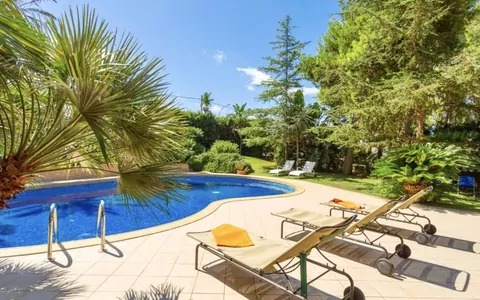 You will be staying in a 5-room villa that spans across two levels, with a total area of 320 square meters. The villa features a spacious living/dining room with a panoramic window and a TV (flat screen), providing direct access to the garden, patio, and swimming pool. The well-equipped kitchen includes an oven, dishwasher, five gas rings, toaster, kettle, microwave, and an electric coffee machine, as well as a small dining table and access to the patio. Additionally, there is a shower room with a bidet and WC on the ground floor. On the upper level, you will find another living room, four bedrooms, and a gallery area. The master bedroom is a spacious 50 square meter room with a bath/shower, bidet, WC, double hand-basin, air conditioning, and forced-air heating, leading to a balcony. The second bedroom features air conditioning and forced-air heating, with access to a balcony. The third room has two beds, air conditioning, and forced-air heating, also with a balcony access. The gallery area includes a double bed and air conditioning.
