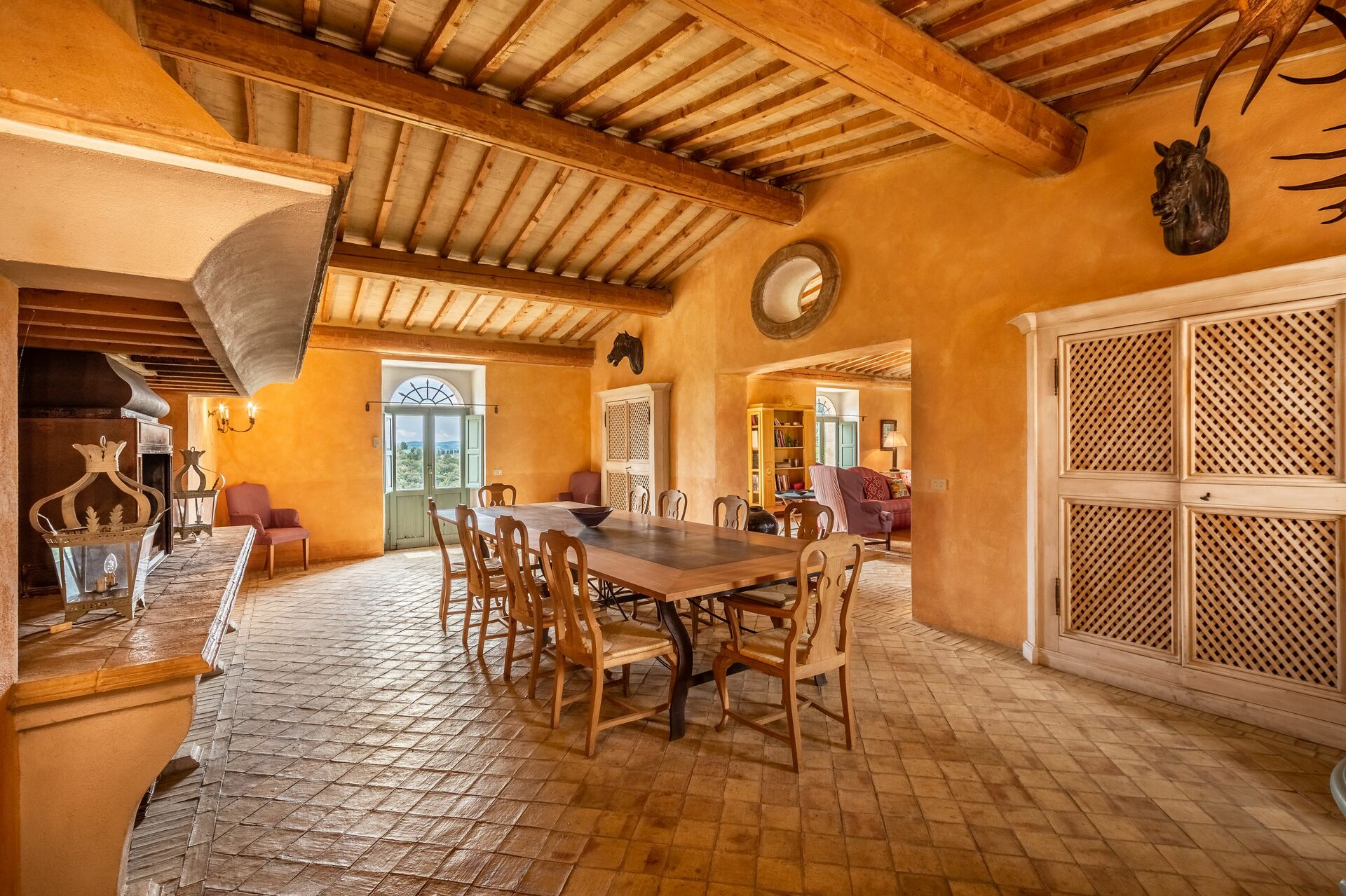 Dining room: dining table (people: 16), WIFI internet, fireplace, exit to the garden, exit to the patio.