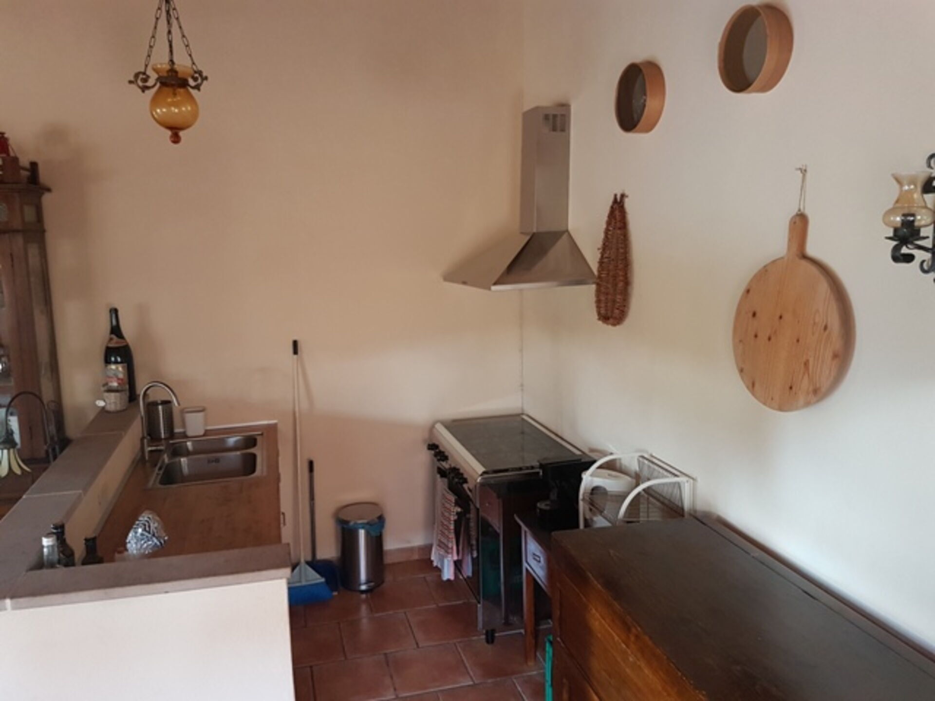Kitchen + living room 2: well equipped kitchen, dining table, fridge, stove top, oven, two armchairs.