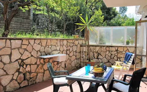 On the upper floor, there are two double bedrooms, each with air conditioning and an exit to the balcony. Additionally, there is a room with three beds and air conditioning, also with an exit to the balcony. You will have access to a bath, bidet, and WC on this level. The apartment boasts a 30-square-meter balcony and a 30-square-meter garden, offering partial views of the sea. The amenities included in your vacation rental are a washing machine, mosquito nets, a hair dryer, and internet (WiFi). One small pet or dog is allowed.
