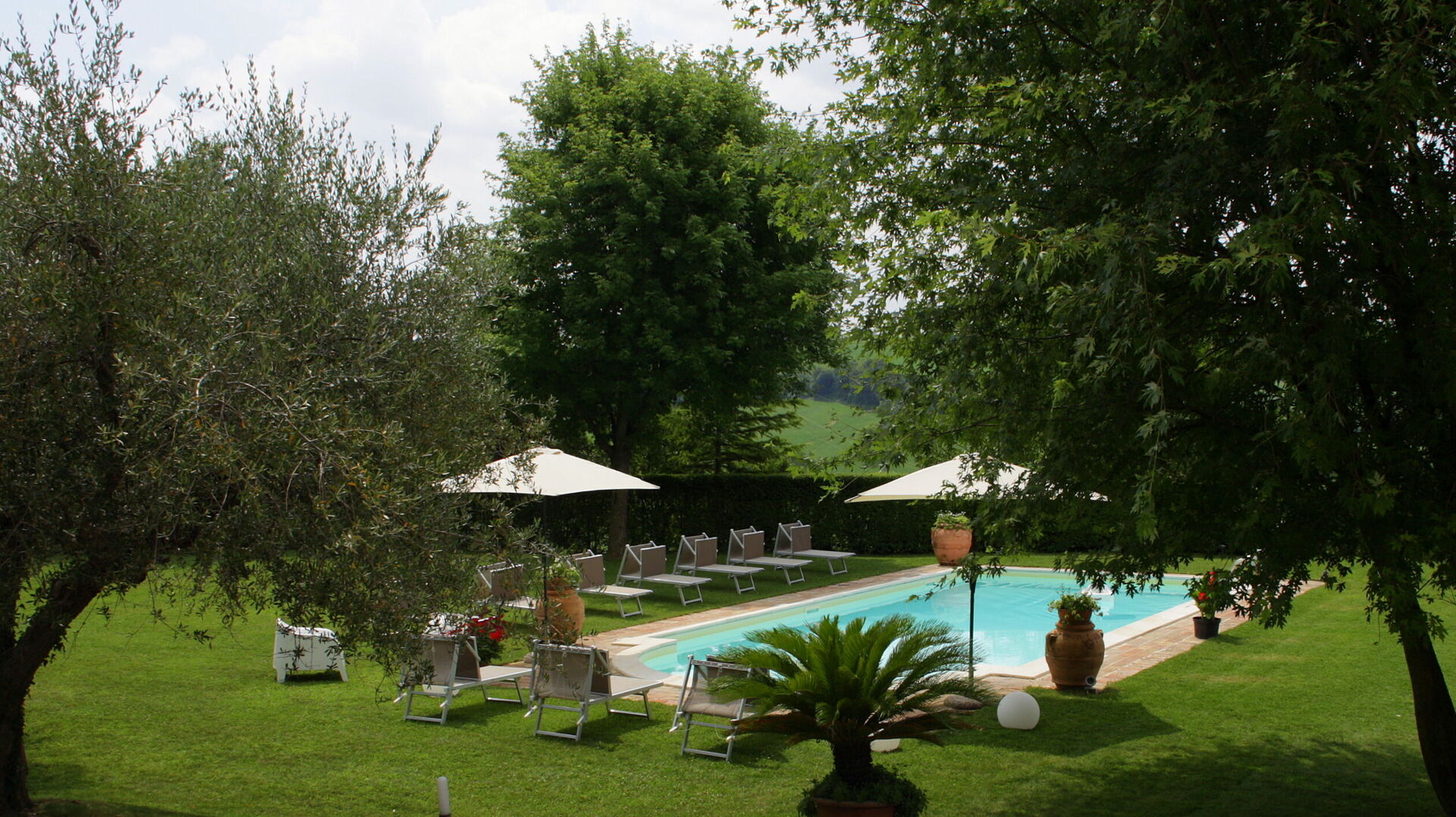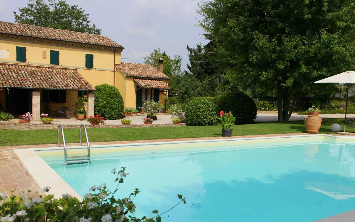 - The farmhouse has: a private garden with a swimming pool furnished with umbrellas and sun beds with a parasol, a porch with tables and armchairs where they can eat or relax.
