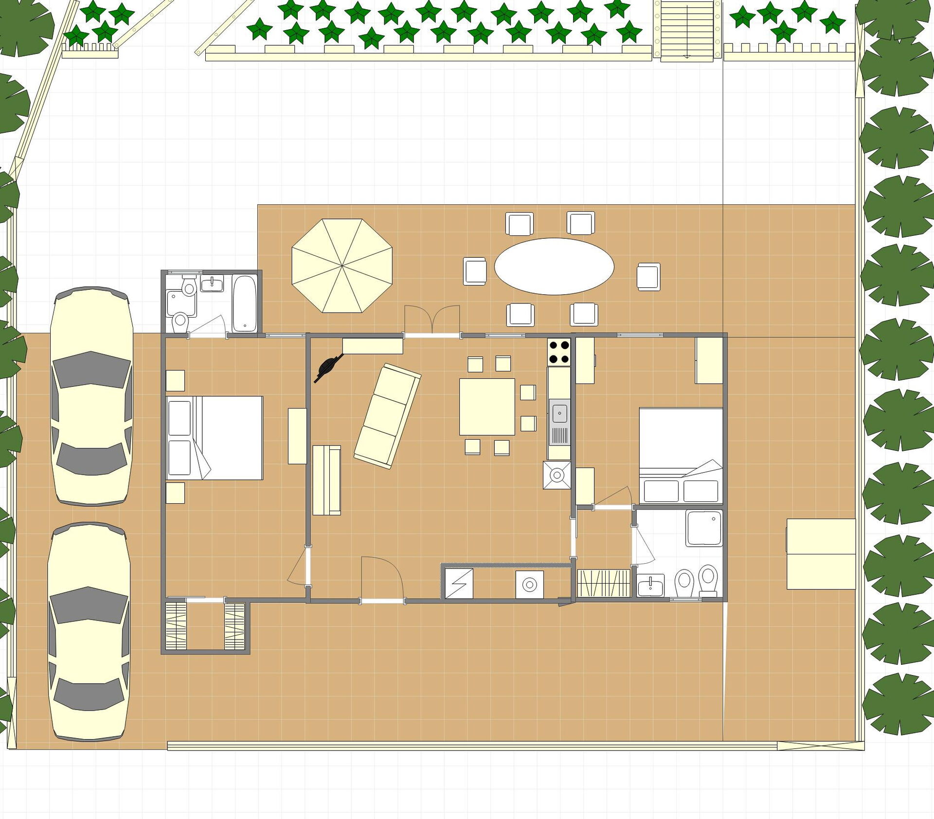 Including: kitchen + living room, 2 bedrooms, 2 bathrooms.