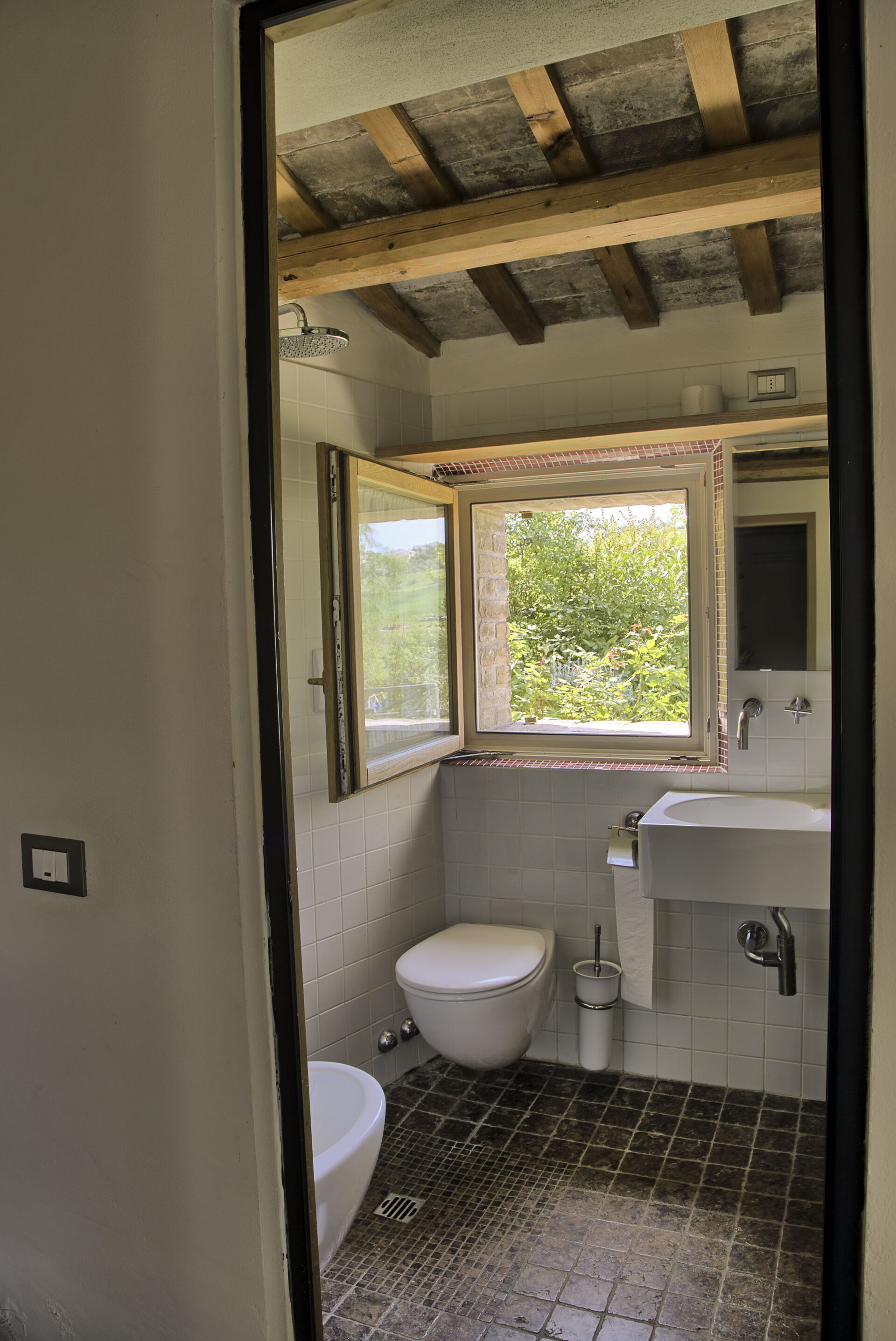 Bathroom 1: basin, toilet, bidet, shower, hairdryer.