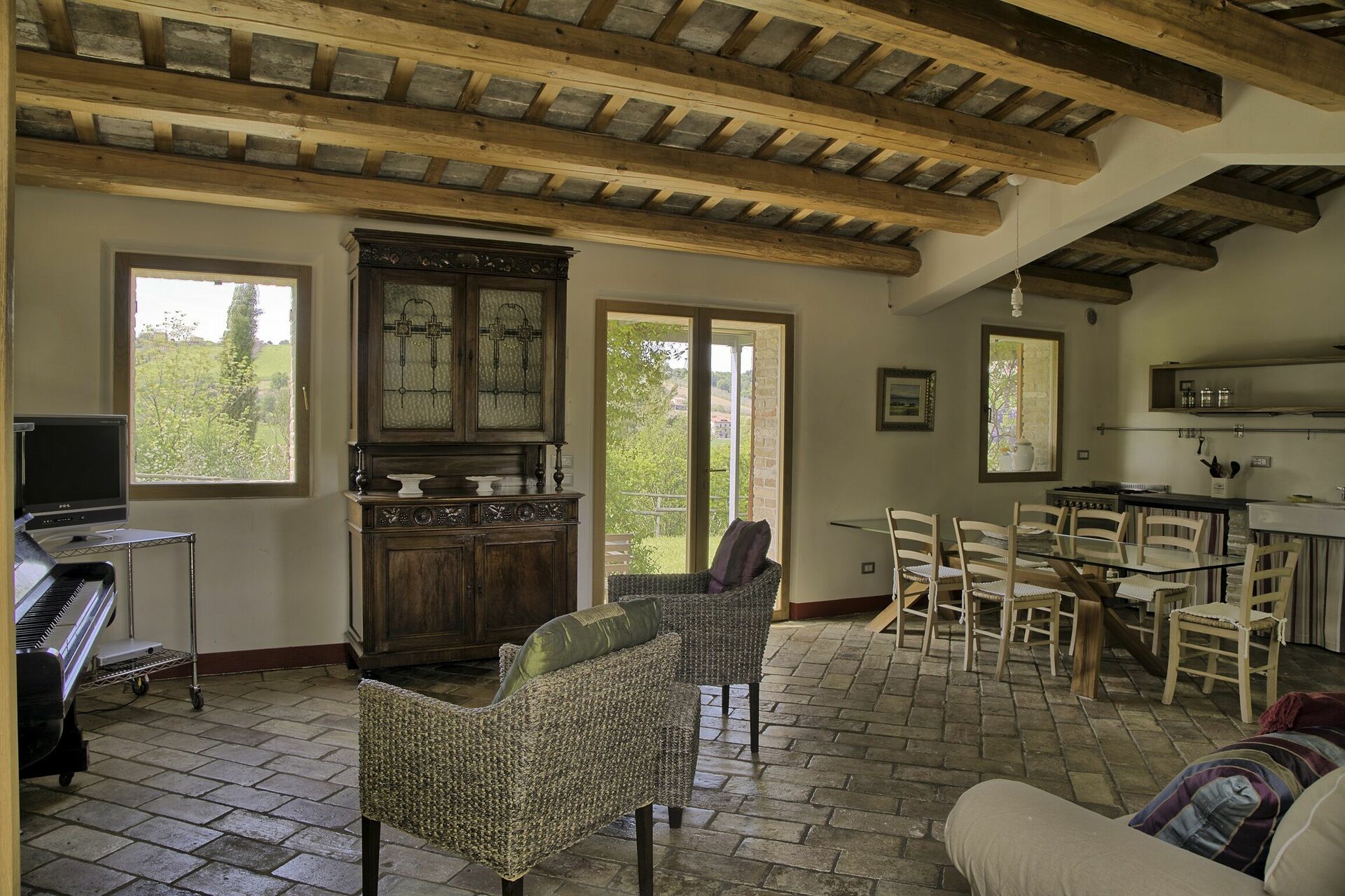 Kitchen + living room: well equipped kitchen, dining table, dishwasher, fridge, freezer, microwave, stove top, wood burning stove, oven, italian coffee machine, american coffee machine, sofa, armchair, working desk, fireplace, WIFI internet, satellite tv, exit to the veranda.