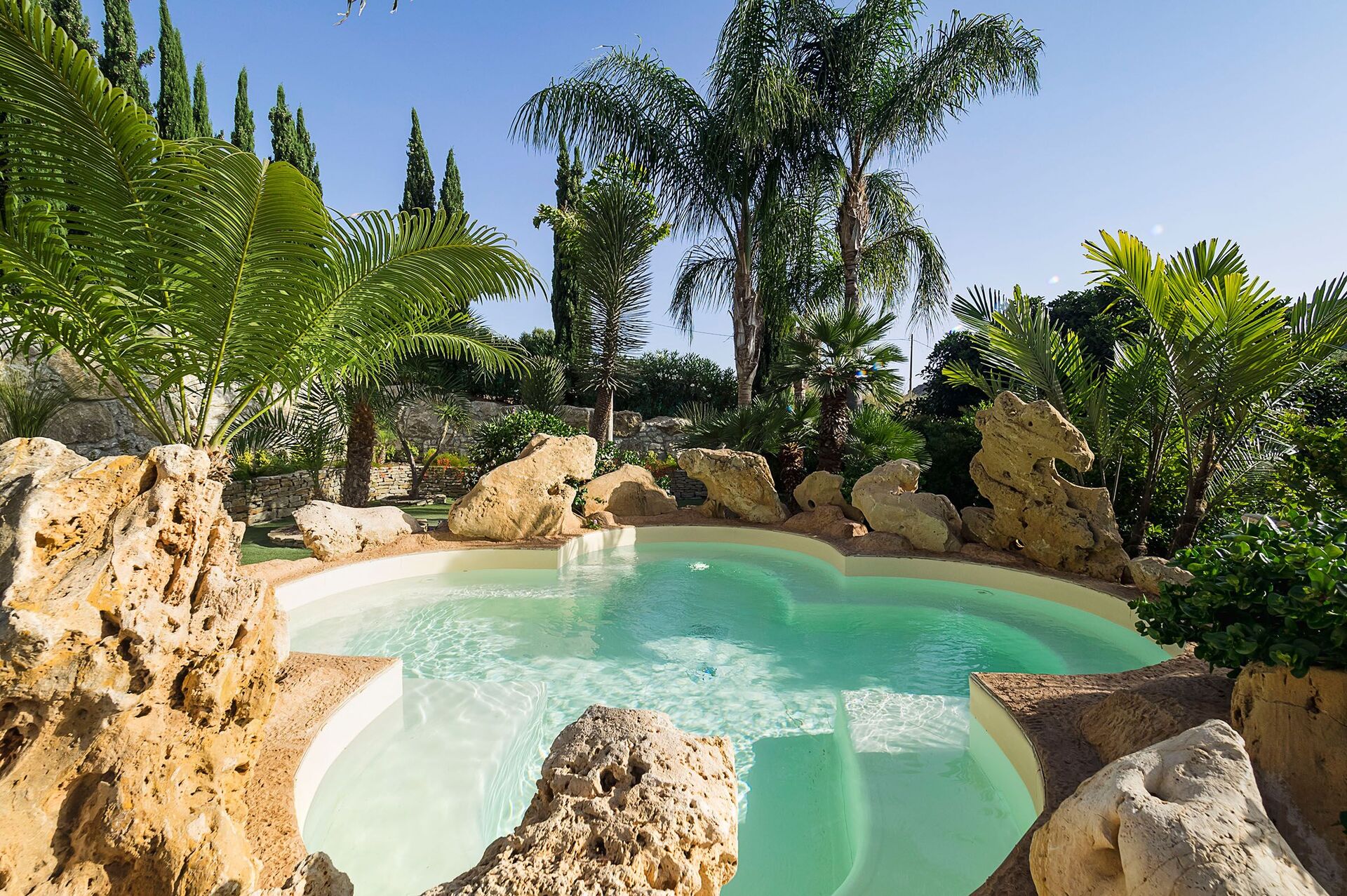 Villa Girgenti is located 5 km (3 mi) from Agrigento, Italy and only 132 km (82 mi) from Palermo in the tourist area "Sicily South Coast". Villa Girgenti is a lovely vacation rental (400 sq m) with air conditioning, hot tub and private pool. The property can accommodate up to 14 people comfortably in seven bedrooms with seven bathrooms. If you'd like to visit the beautiful Italian coast, it's just a short distance to the sea (7 km 4 mi).