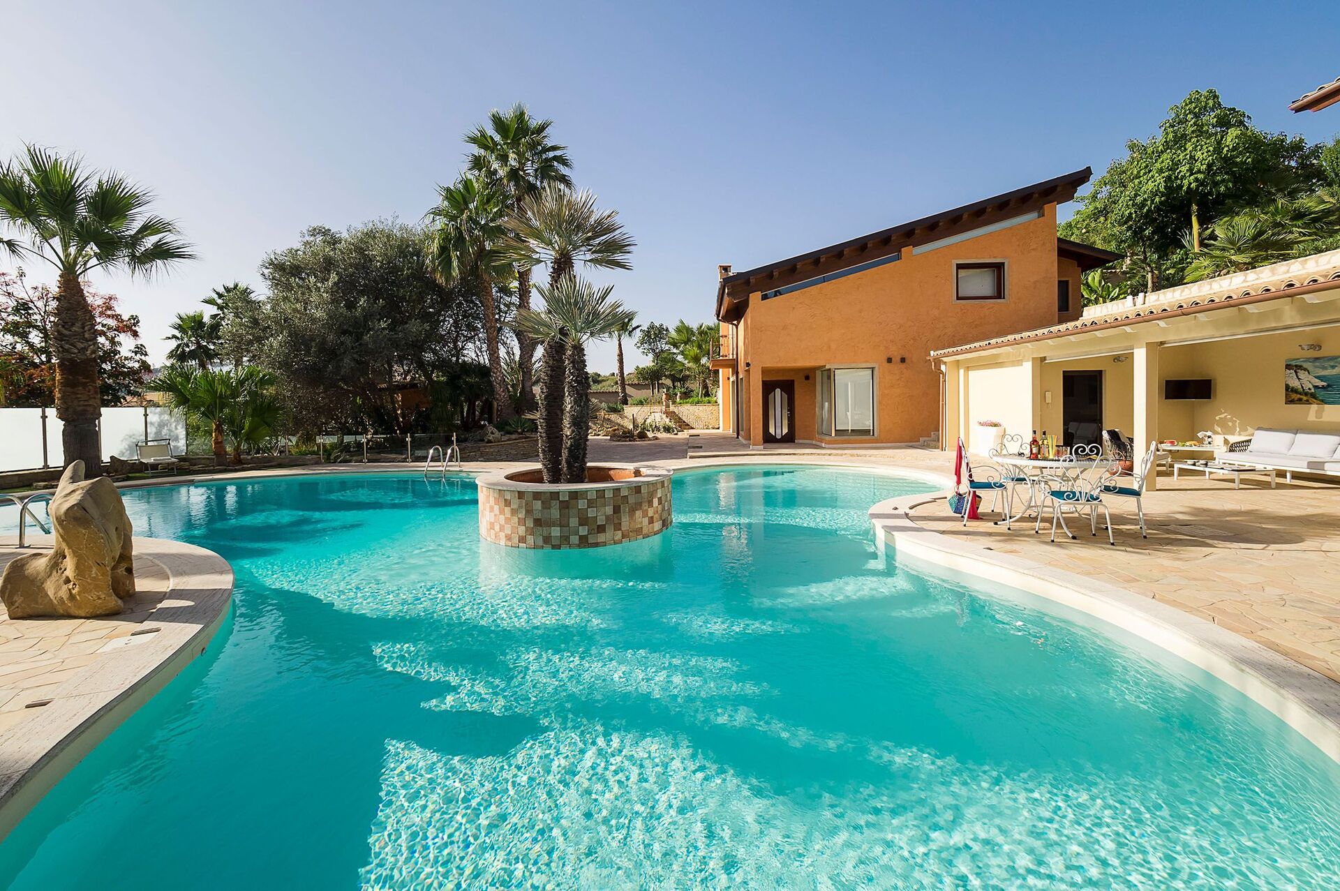 After arriving at Villa Girgenti you’ll find a nice clean well-maintained property perfect for a peaceful holiday in Sicily. Regardless of how you spend your days - sightseeing, shopping, visiting museums or just driving in the countryside, when you arrive home you can relax with your family and friends at the pool for a perfect ending to another day in Sicily. For your pleasure, on the grounds there is a patio, barbecue grill and hot tub. Dining with friends and family is a huge part of the Italian culture. Take advantage of the well-equipped kitchen to prepare meals using local produce while on your holiday. The kitchen includes coffee machine, microwave, toaster, stove and refrigerator, as well as, plenty of tableware and cutlery for up to 14 people. Dine 'al fresco' like a real Italian, the fully furnished patio is the ideal setting to enjoy food, family and the lovely Italian weather.
