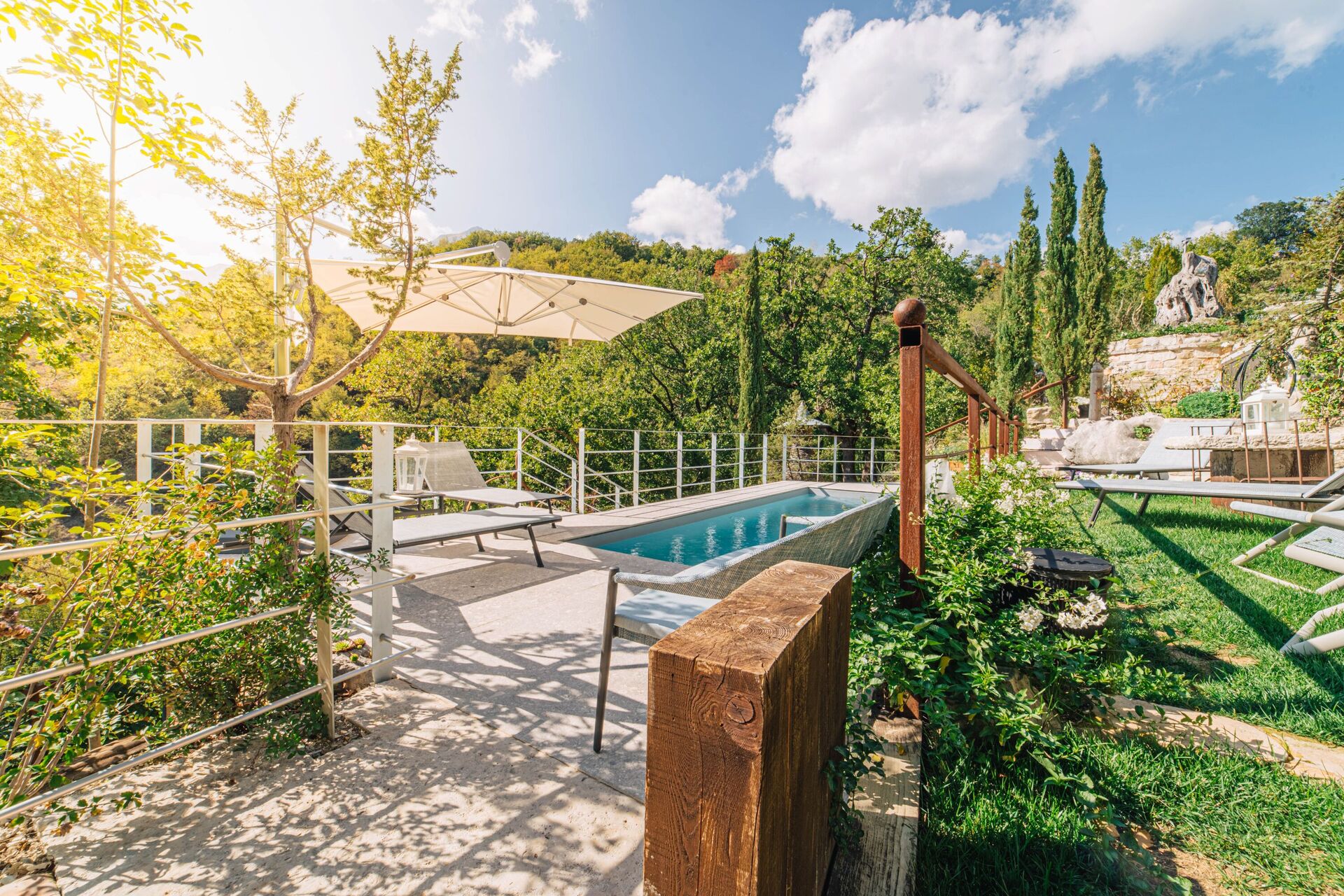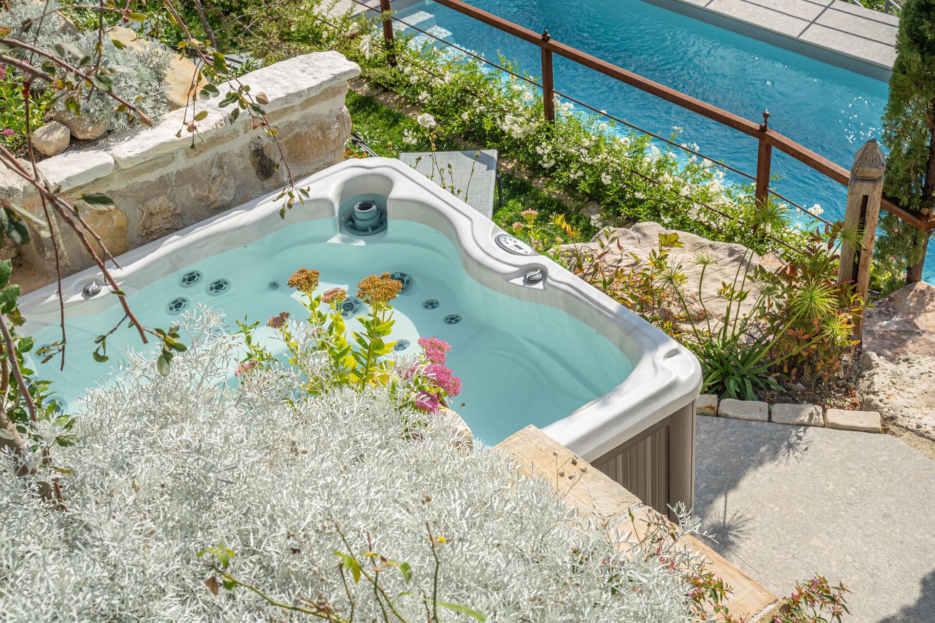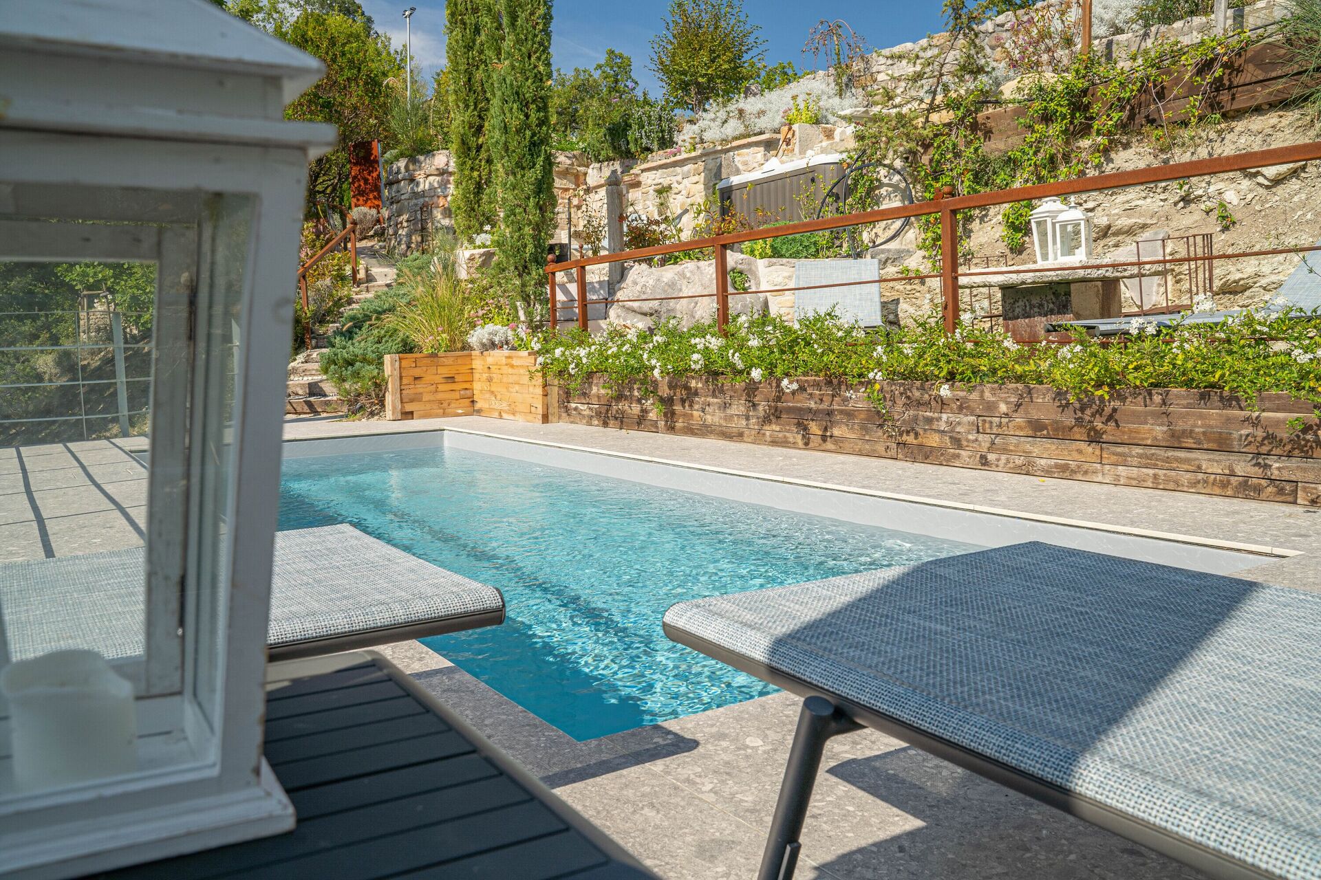 Garden: swimming pool (private, length: 2.5m, width: 7m, depth: 1.4m, outdoor), outdoor hot tub, shower, barbecue, al fresco dining, two dining tables (people: 10), garden furniture, sunbed.