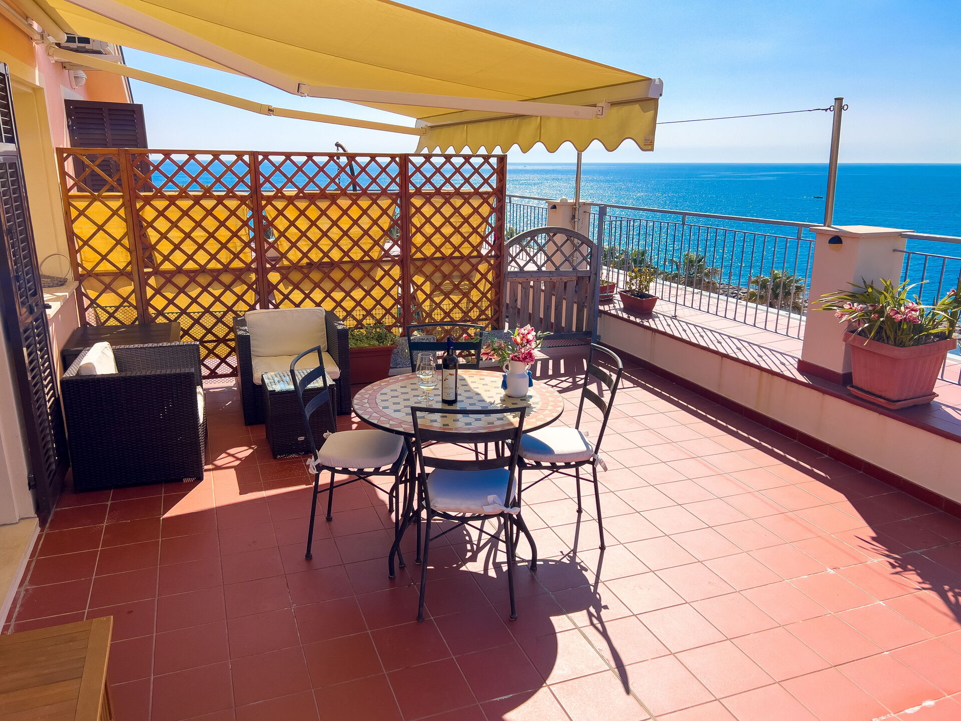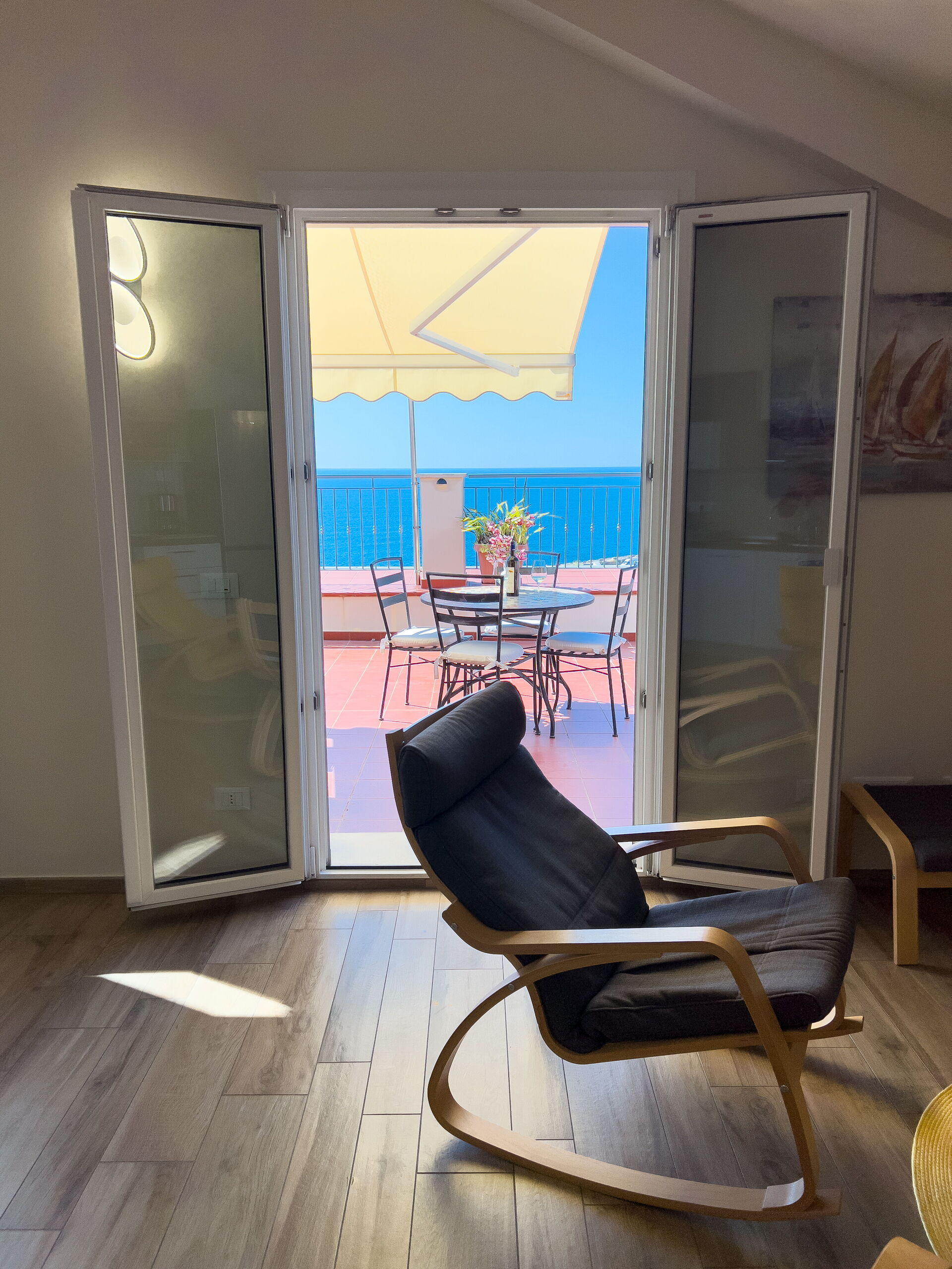 Sea-view terrace, with table and chairs, sunshade. Perfect for al fresco dining and relaxing breakfasts with a sea-view!