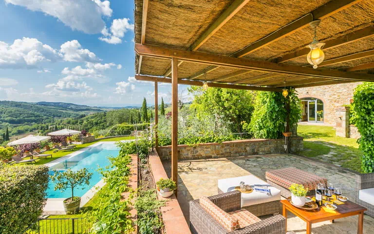 The outdoor spaces at Lamore di Carla are truly exceptional, designed to immerse guests in the serene beauty of the surrounding Chianti landscape. The terraced garden extends across 1,000 square meters and is fully fenced, creating a safe and secure environment that is particularly well suited for families with children. The magnificent swimming pool, measuring 16 by 6 meters with a depth ranging from 120 to 200 centimeters, is available seasonally from April 8th to September 30th and is also enclosed by fencing for added safety. Overlooking the verdant rolling hills of the Chianti region, the pool area provides an idyllic setting for relaxation and leisure. Guests can freshen up in the outdoor shower conveniently located nearby, gather around the barbecue for al fresco dining, and unwind on the garden furniture thoughtfully arranged throughout the outdoor areas. Large terraces connect the main house and the annex, serving as elegant transitional spaces where guests can enjoy the open air, take in the sweeping countryside views, and share memorable moments together in a truly enchanting natural setting.