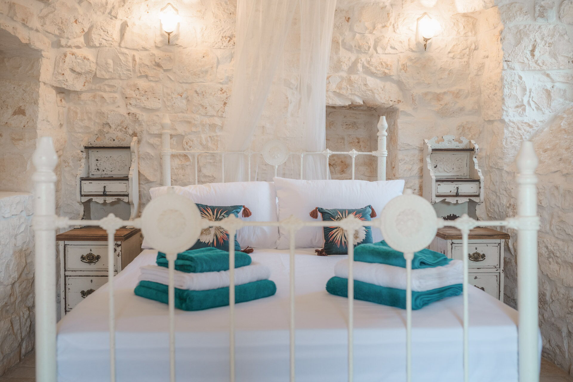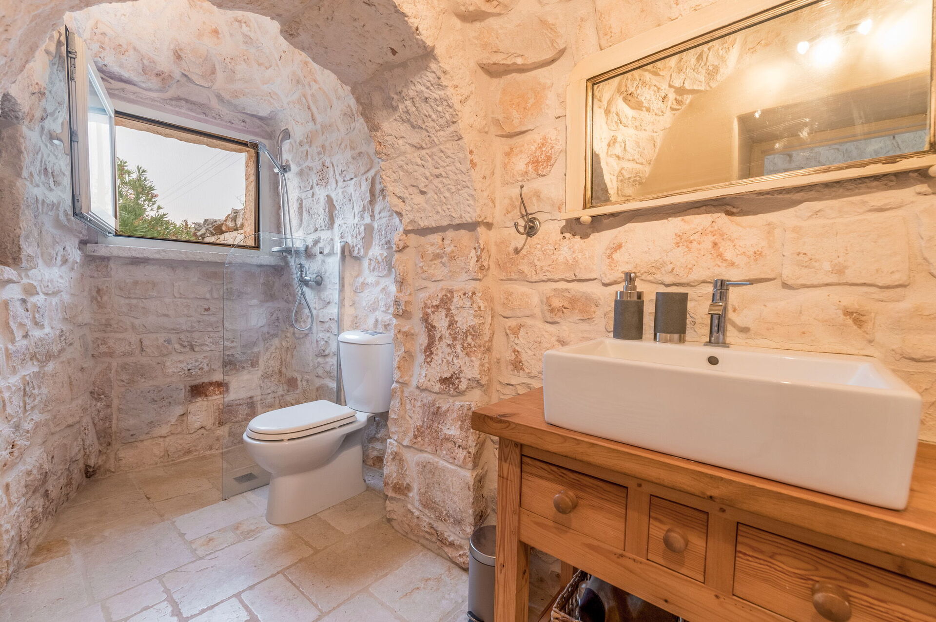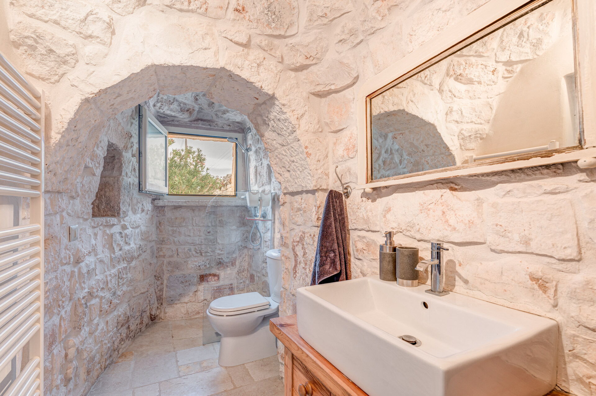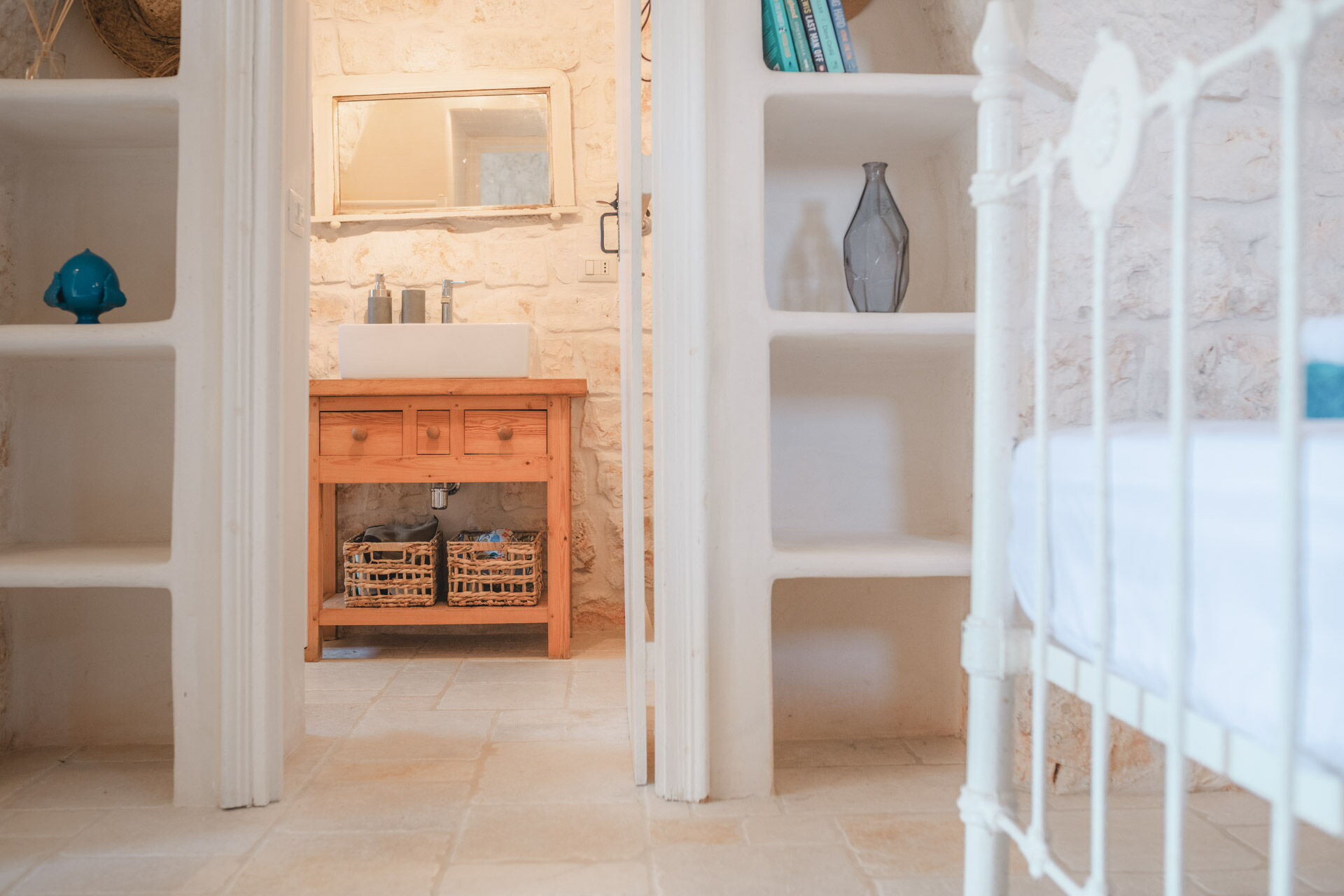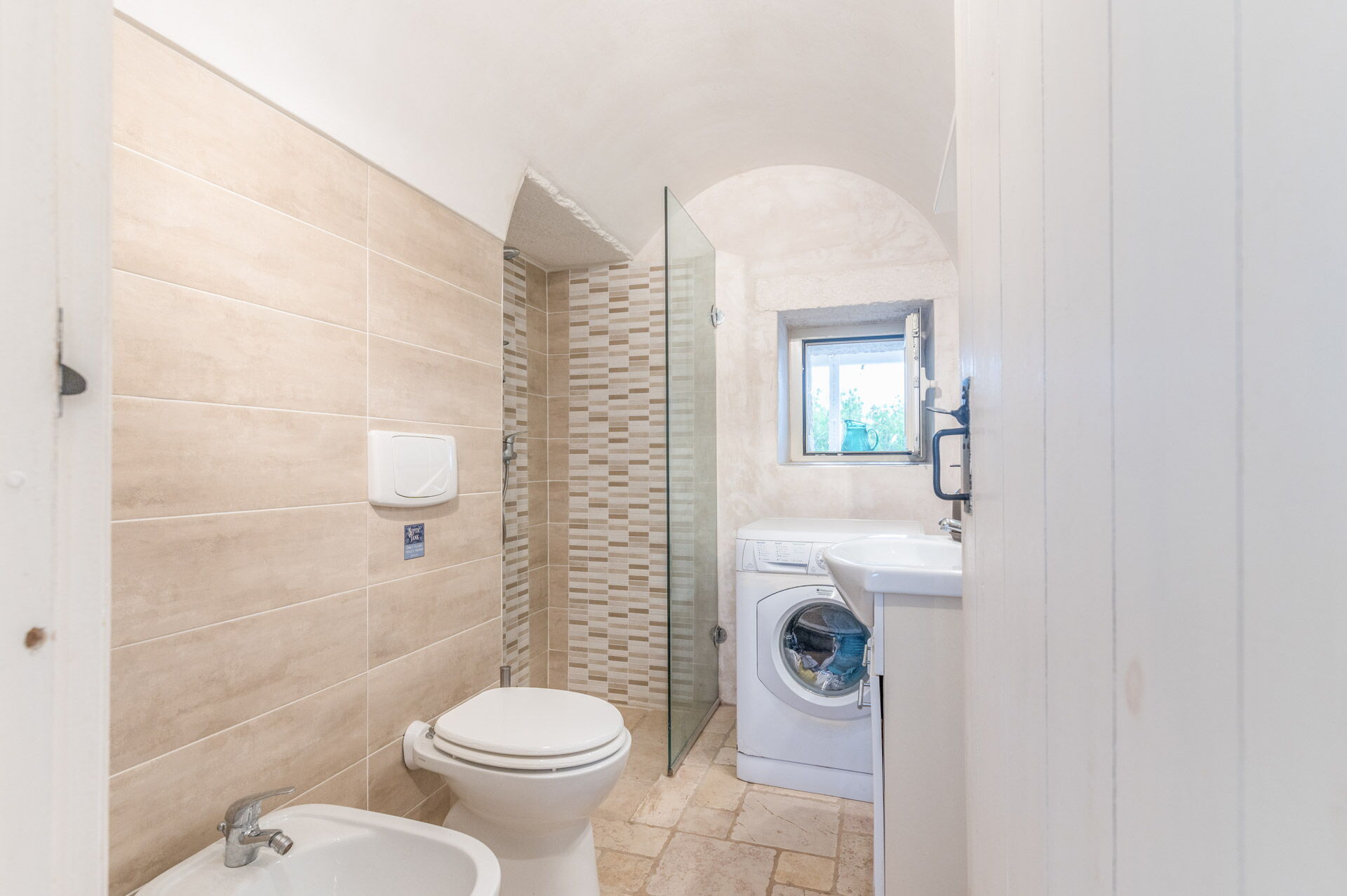 The main bedroom, with independent external and internal access, can be reached from the kitchen, is located in the most historic and ancient part of the Trullo and has exposed stone walls. The room has a double bed with a wrought iron structure, two bedside tables, and a chest of drawers. With private access from the bedroom, there is the bathroom, with a window, complete with sink, toilet, bidet and shower.