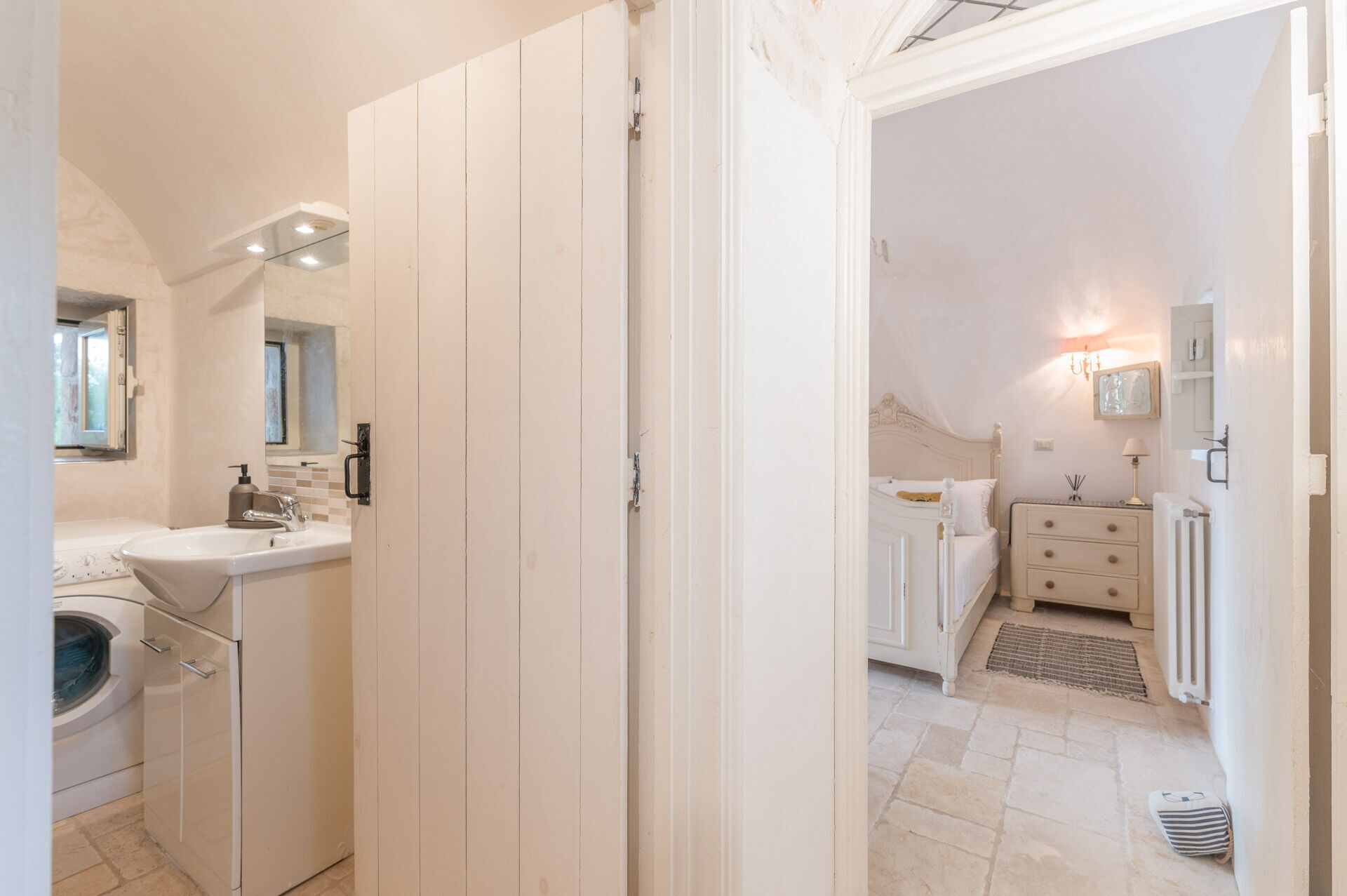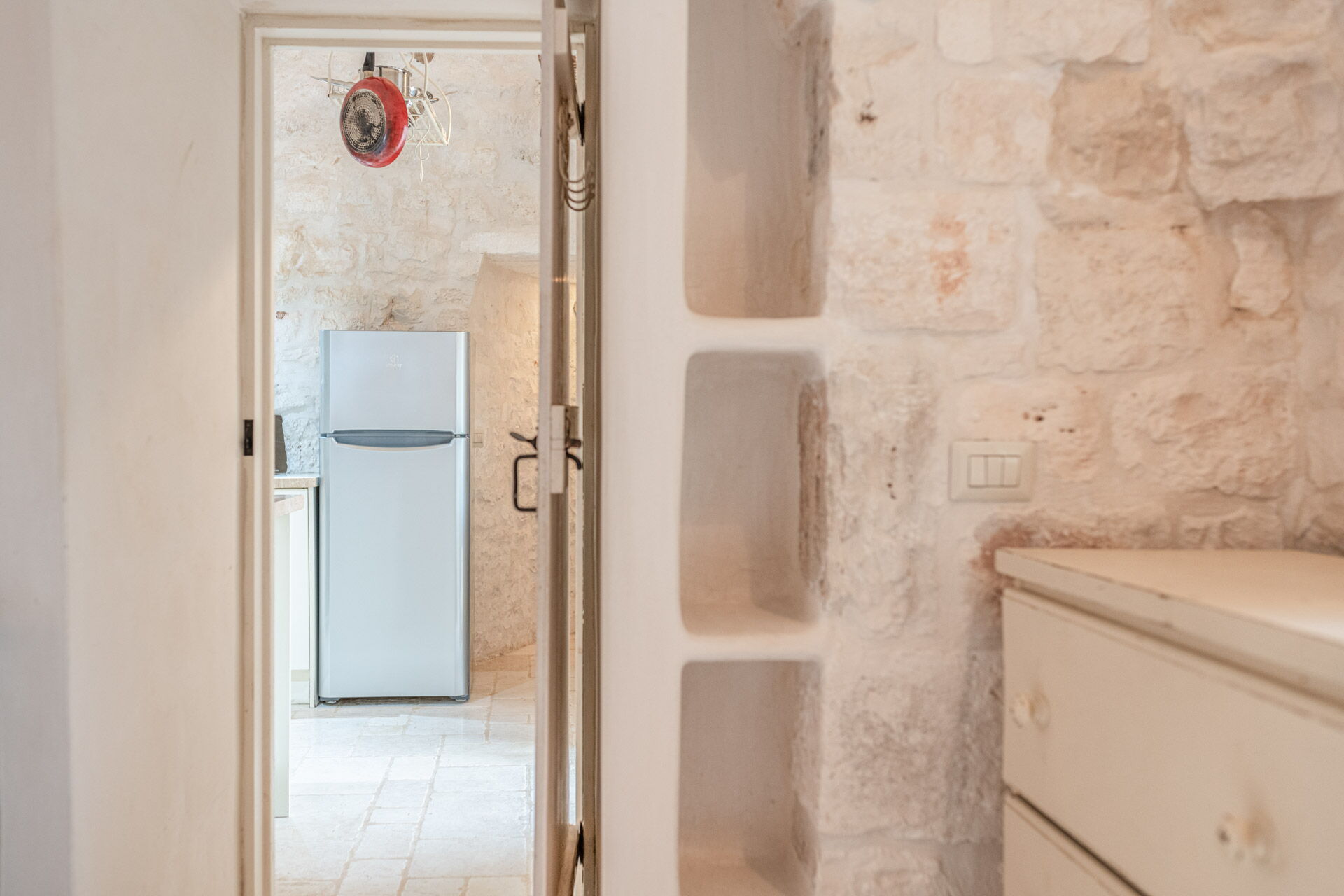 The Trullo can be an entry from both the living room and the kitchen. The full kitchen, central to the Trullo, has a hob with a gas stove and overhanging hood, a sink, a fridge with a freezer and a dishwasher.